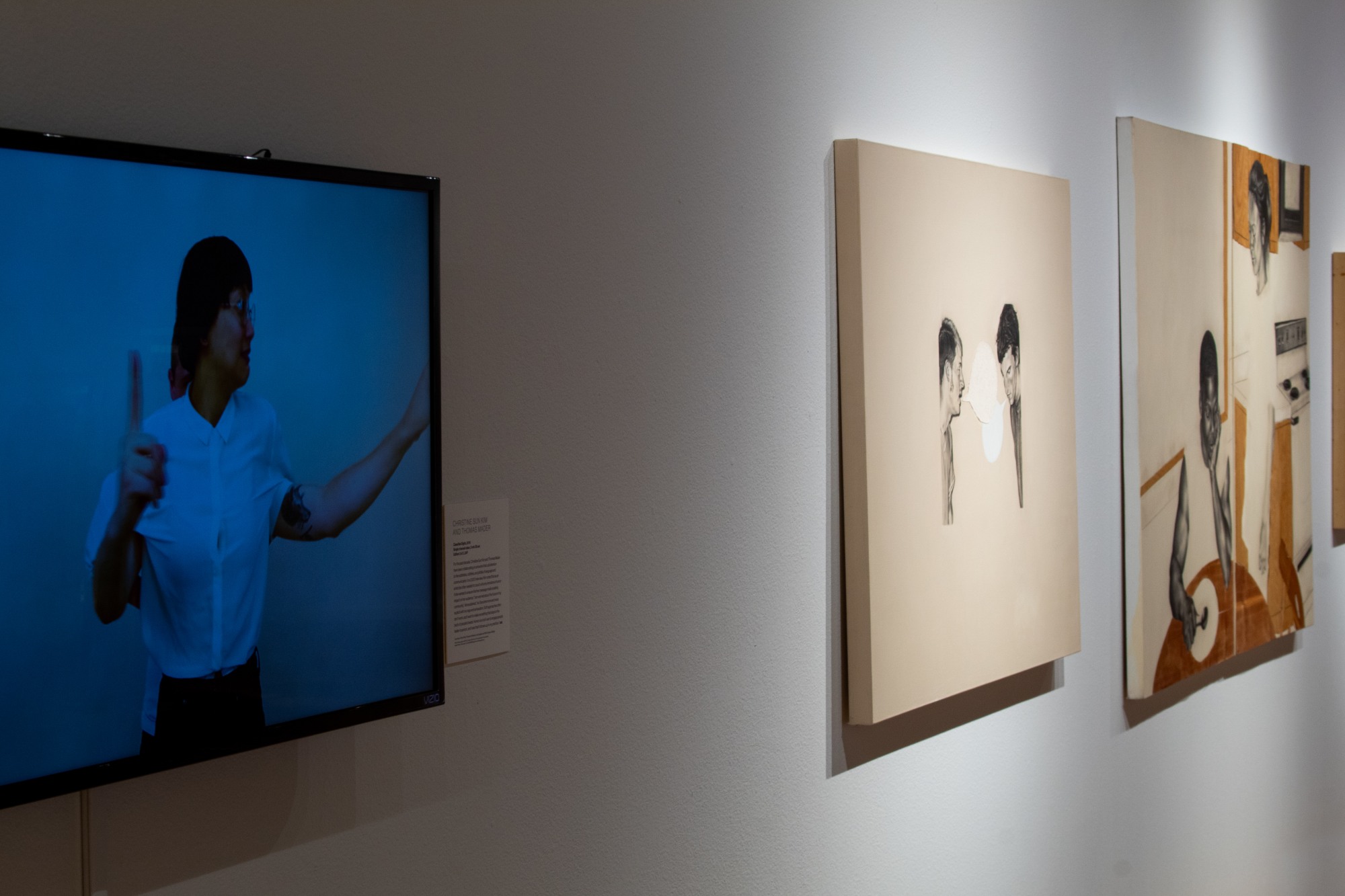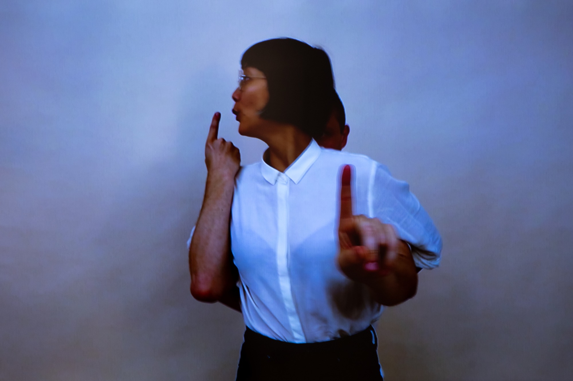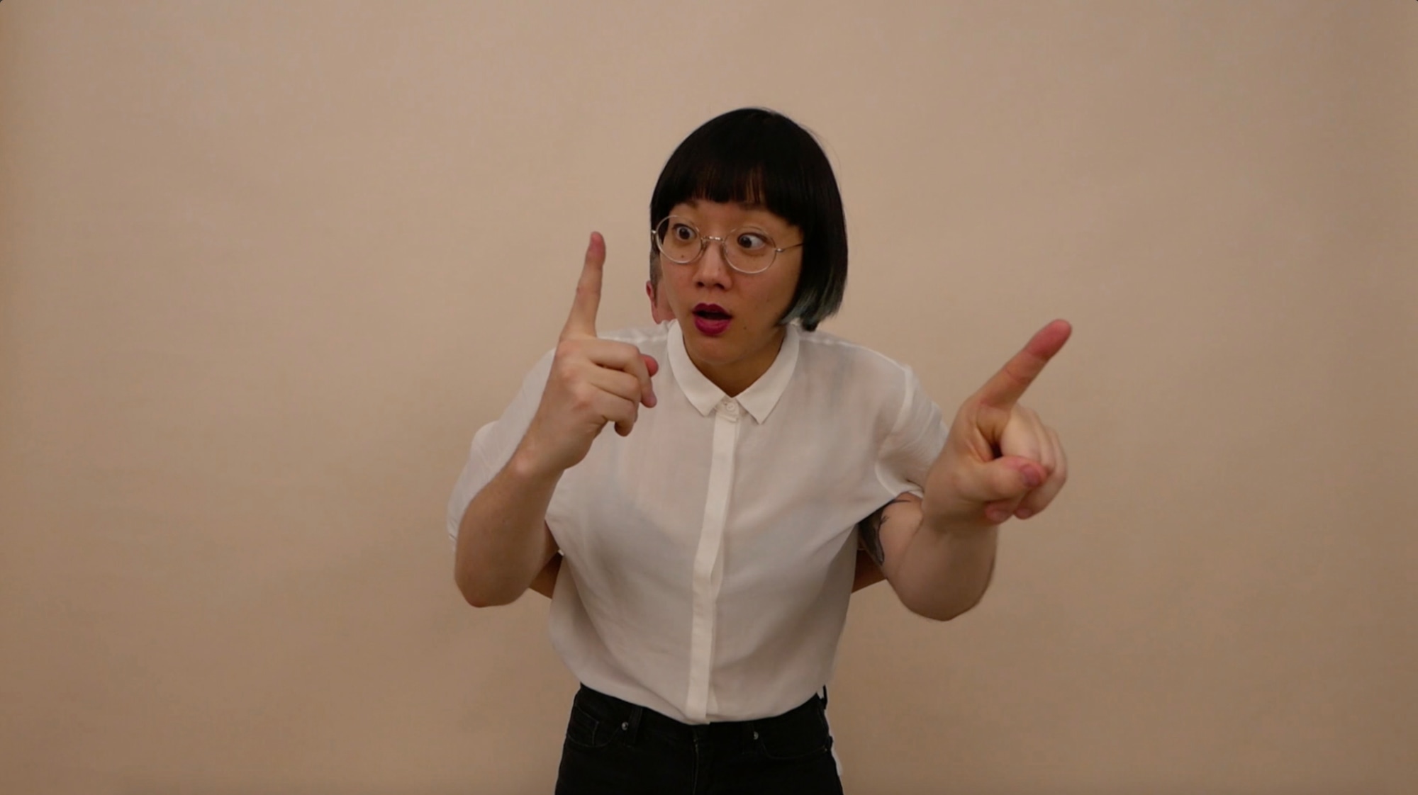 In this collaborative video made with the conceptual artist Thomas Mader, Christine Sun Kim utilizes the unique grammatical structure of American Sign Language to represent complicated social interactions. In ASL, a raised index finger can stand for a person (and multiple fingers for a group), which, in combination with the intricacies of facial expression, can efficiently convey complex situations such as tripping while trying to avoid an ex, Skyping with a spotty internet connection, and judging another person’s groceries in the checkout line. The video humorously pairs Mader’s gestures with Kim’s facial expression, emphasizing the basis of cooperation on which all communication is built.
