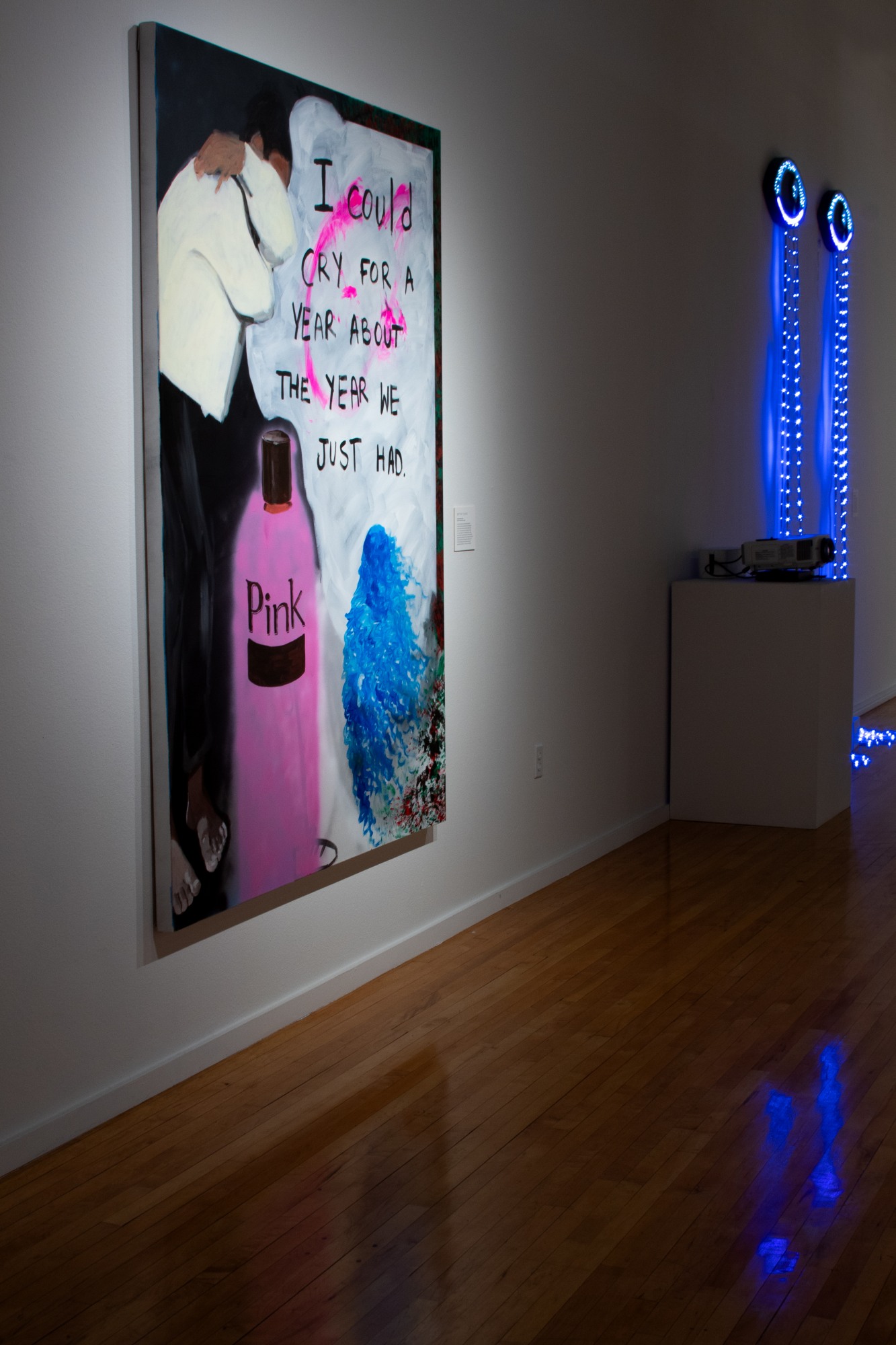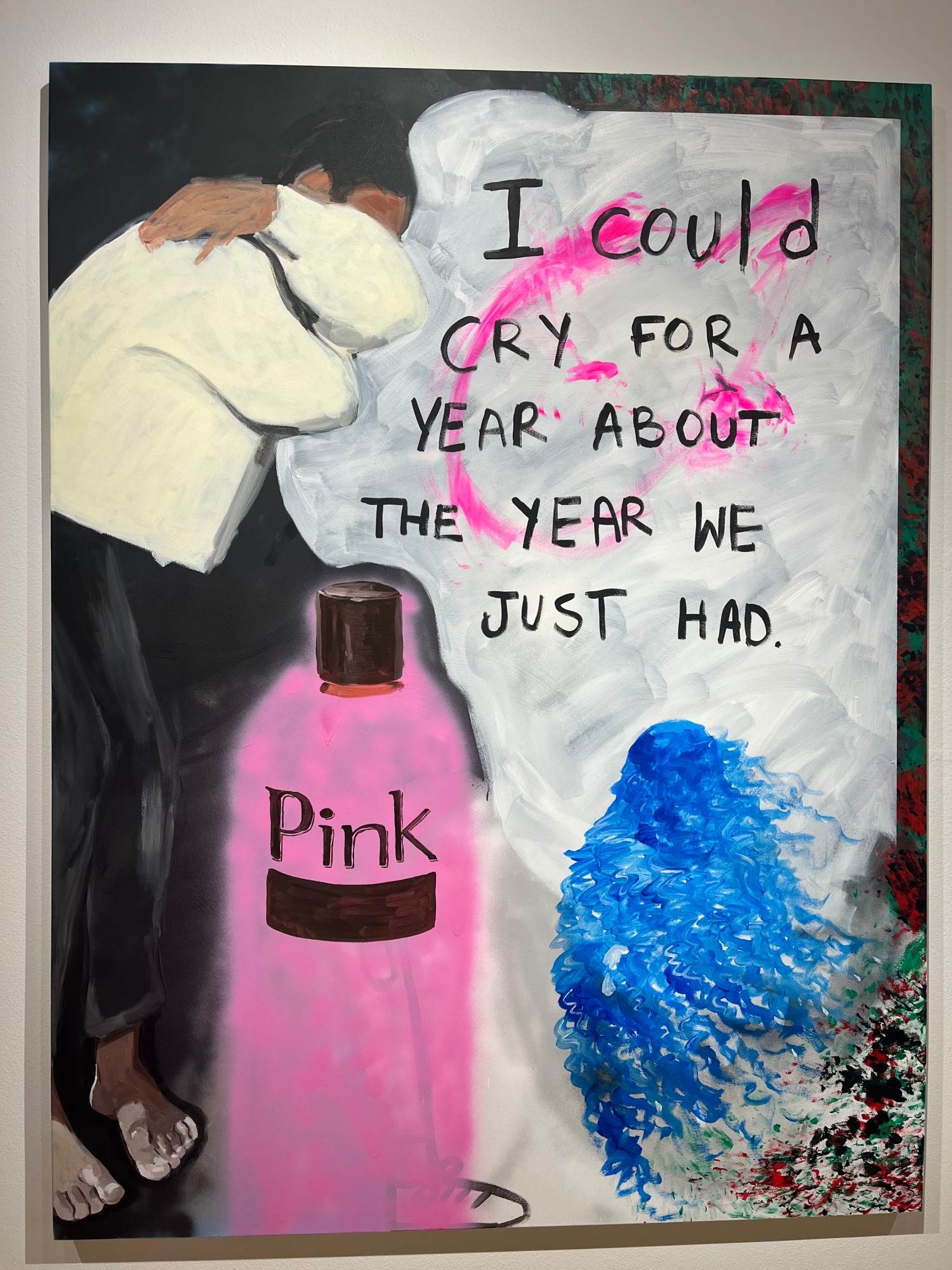 The emotions in Brittany Tucker’s paintings are often manifested as interactions between her own realistically-rendered self-portrait and a second figure depicted as a cartoon. This clever technique underlines the difference between her vision of herself and the ideas about others that haunt her imagination and contribute to her perception of the world. The other figure is often an intrusive white man, or—as seen elsewhere in The Emotional Show—a Black woman. In Emotional Outburst she represents herself reacting directly to the traumatizing speed at which she (along with everyone else) was pressured to move forward through the perspective-shifting events of 2020. Other paintings in the same series are spray-painted with words like “riot,” “wild,” and “not OK.”