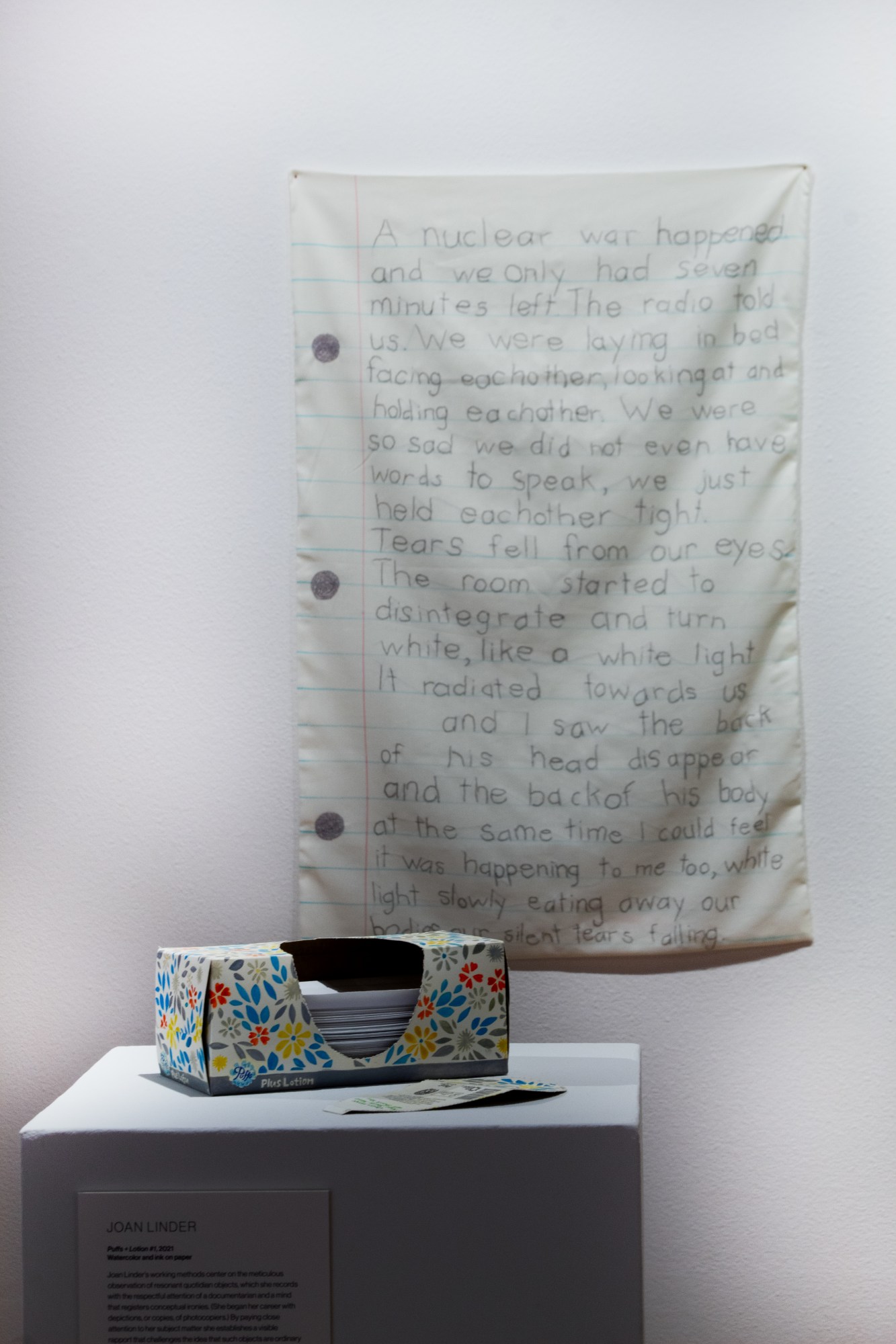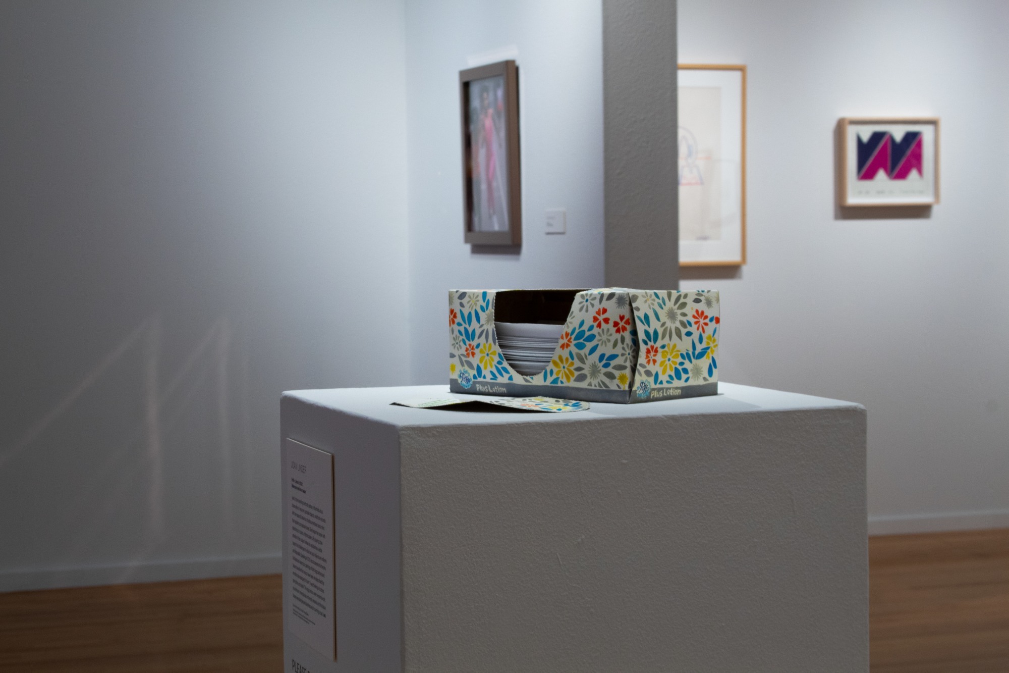 Joan Linder’s working methods center on the meticulous observation of resonant quotidian objects, which she records with the respectful attention of a documentarian and a mind that registers conceptual ironies. (She began her career with depictions, or copies, of photocopiers.) By paying close attention to her subject matter she establishes a visible rapport that challenges the idea that such objects are ordinary and disposable. Speaking in 2020 about a series of artworks that featured watercolor paintings of both egg cartons and tissue boxes like the ones on view here, she described the emotions she assigned to them: “I was thinking a lot about springtime and death. The egg cartons were women’s work, nourishment, menopause and empty vessels, and the tissue boxes were allergies and sadness and mourning a loss.”