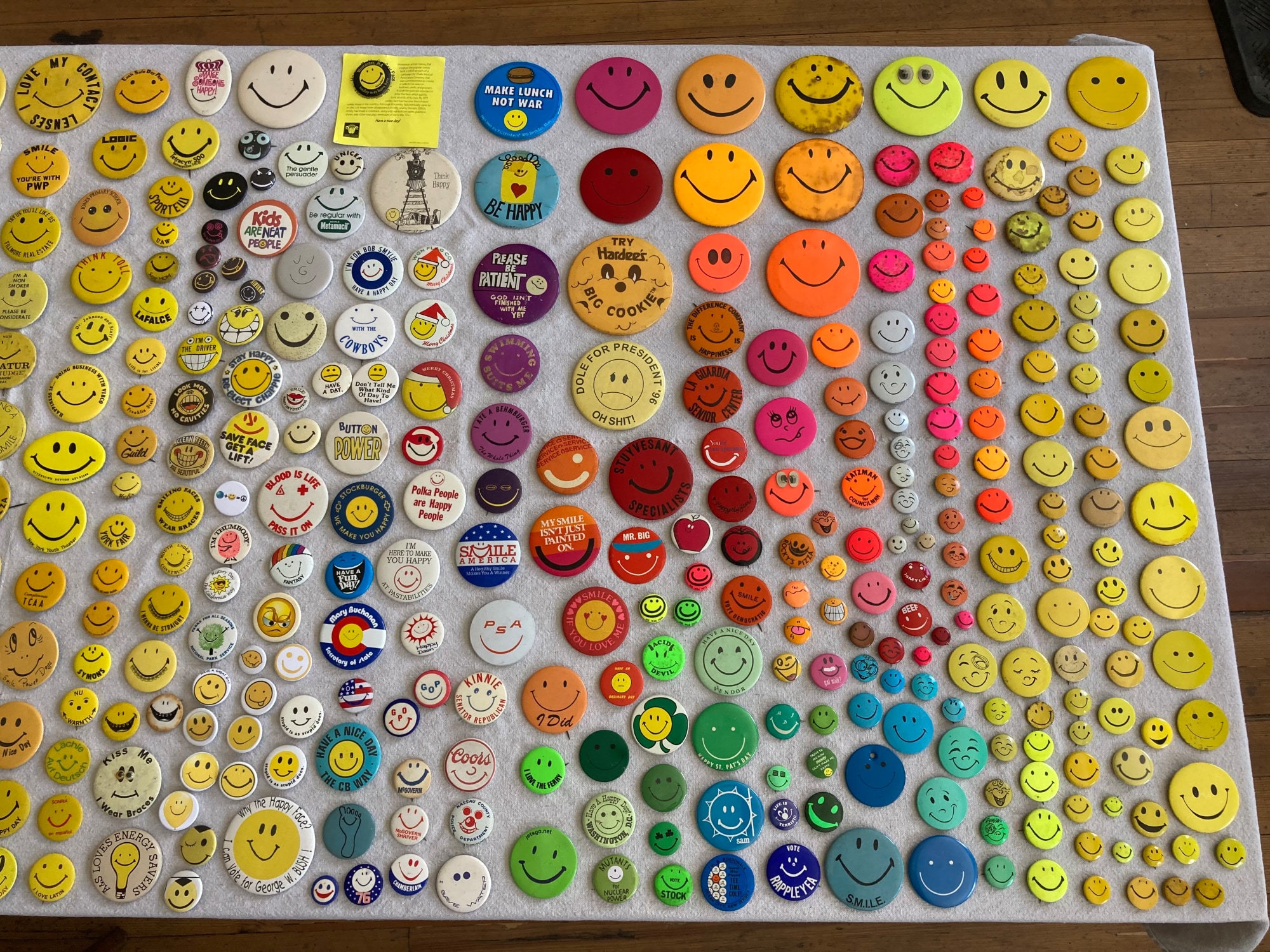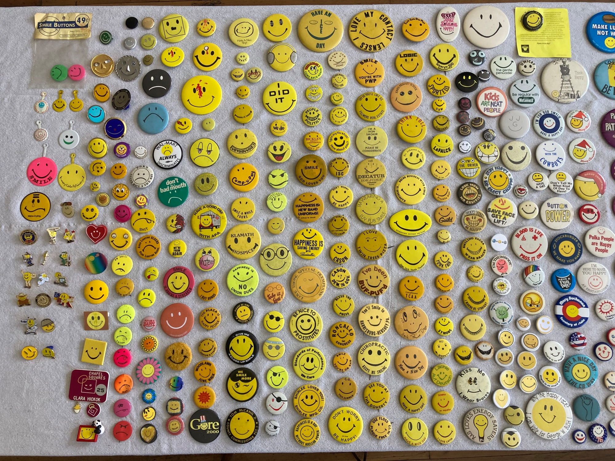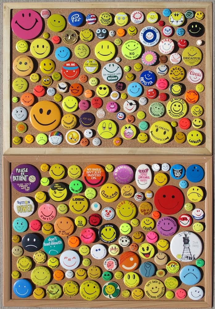 The Smile Face Museum was founded by Mark Sachs in his Maryland basement in 1992. Curations from the Museum’s collection have been exhibited in Brooklyn, New York, Richmond, Virginia, and at Frieze London in the U.K. Its holdings, which include up to 5,000 objects decorated with the iconic smiley face logo, hint at the boundless possibilities that have come from commercializing the emotion of happiness. The logo is so ubiquitous that it is expected to increase the visibility of whatever it is attached to. These things include cookies, slippers, toilet paper, radio stations, tissue boxes, politicians, whoopee cushions, fiber supplements, flu shots, ice cream, golf balls, floss, orthodontic braces, cameras, shorts, clocks, religion, jewelry, pencils, comic books, fly swatters, video games, coffee, beanies, garbage cans, bands, frisbees, DNA, life insurance, bombing campaigns, palliative care facilities, the National Park Service, and the personal qualities of people. (“I don’t get mad. I get even,” reads one button that is not included in this display.)