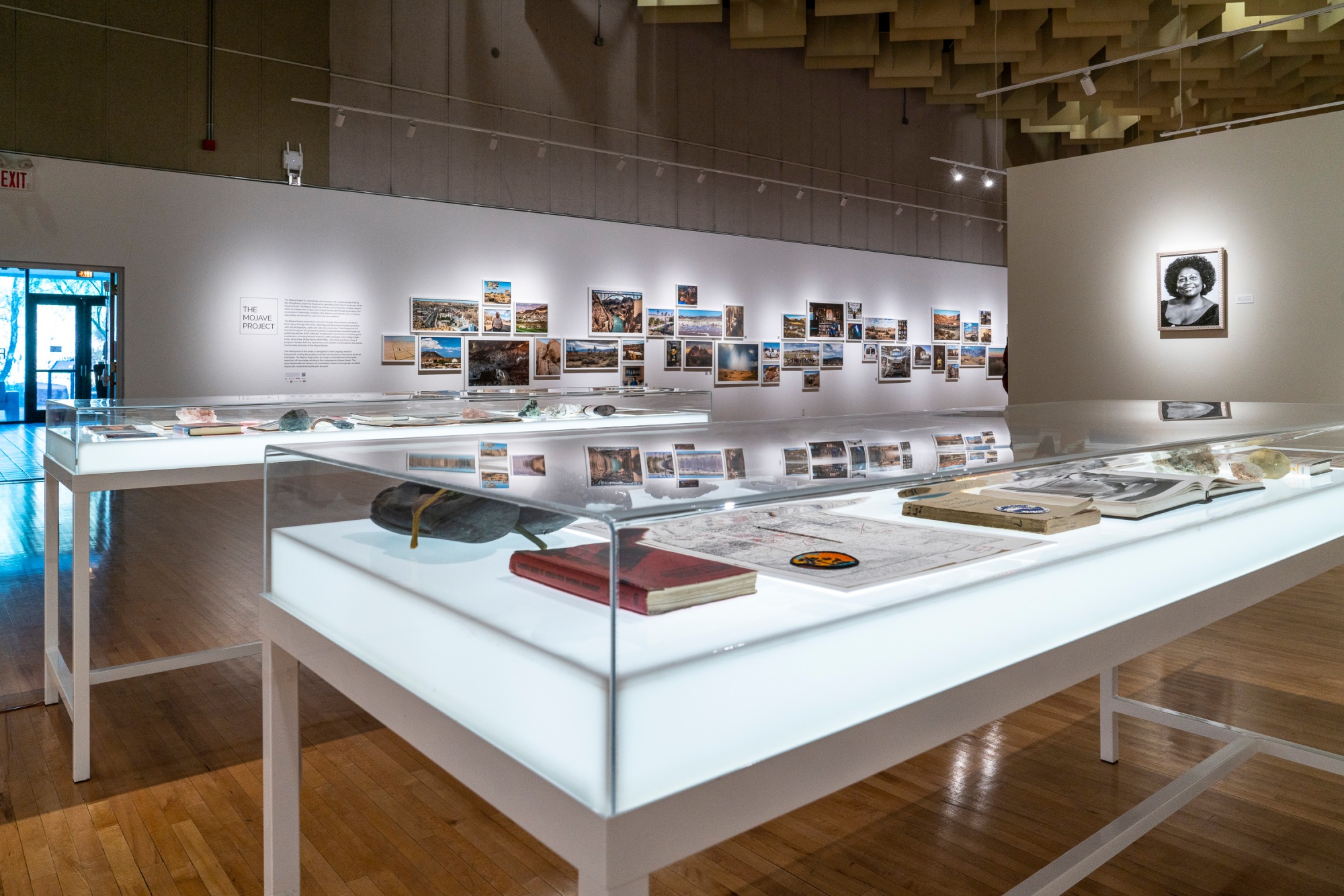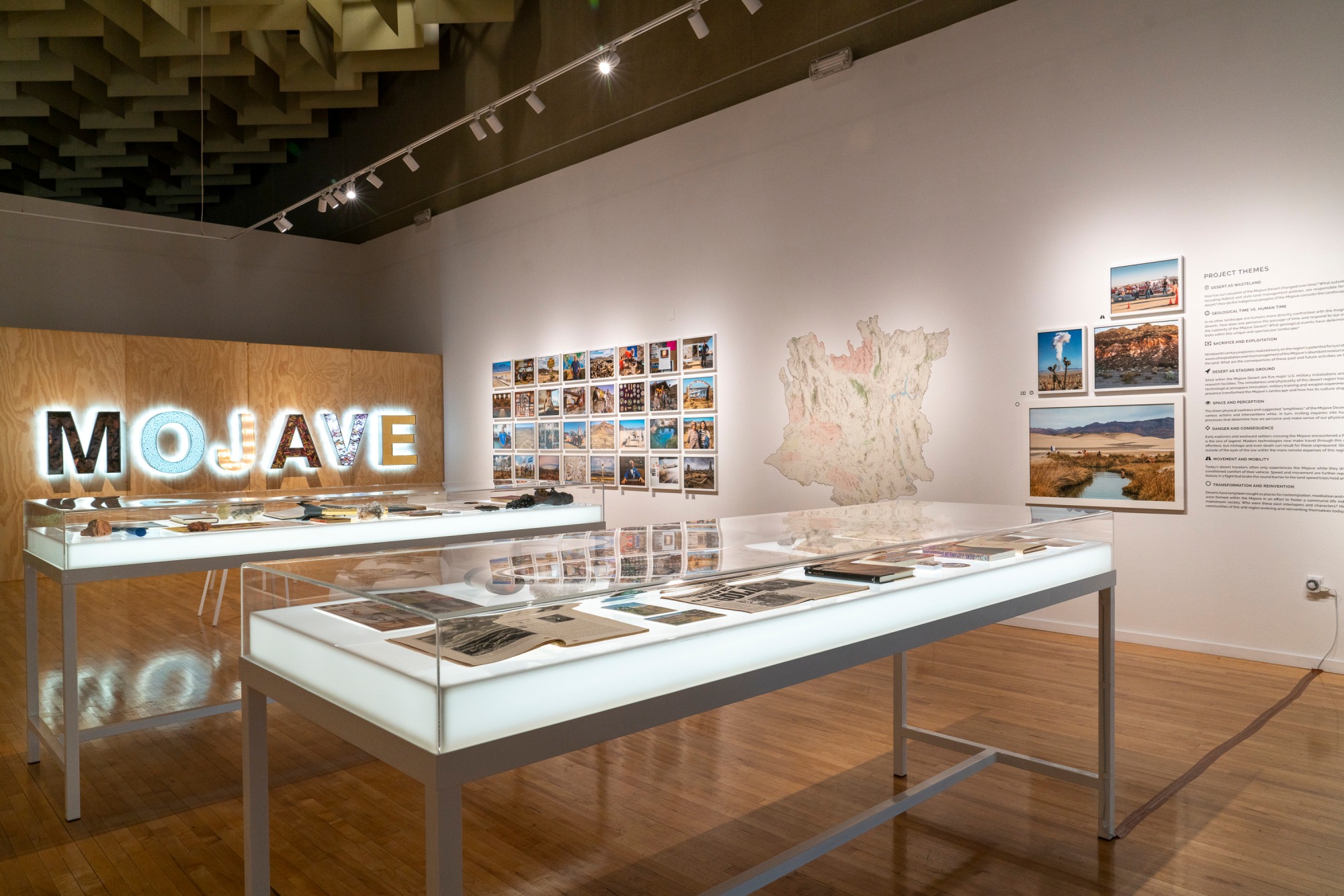 A collection of specimens, books, and symbolic artifacts representing the Mojave Desert.