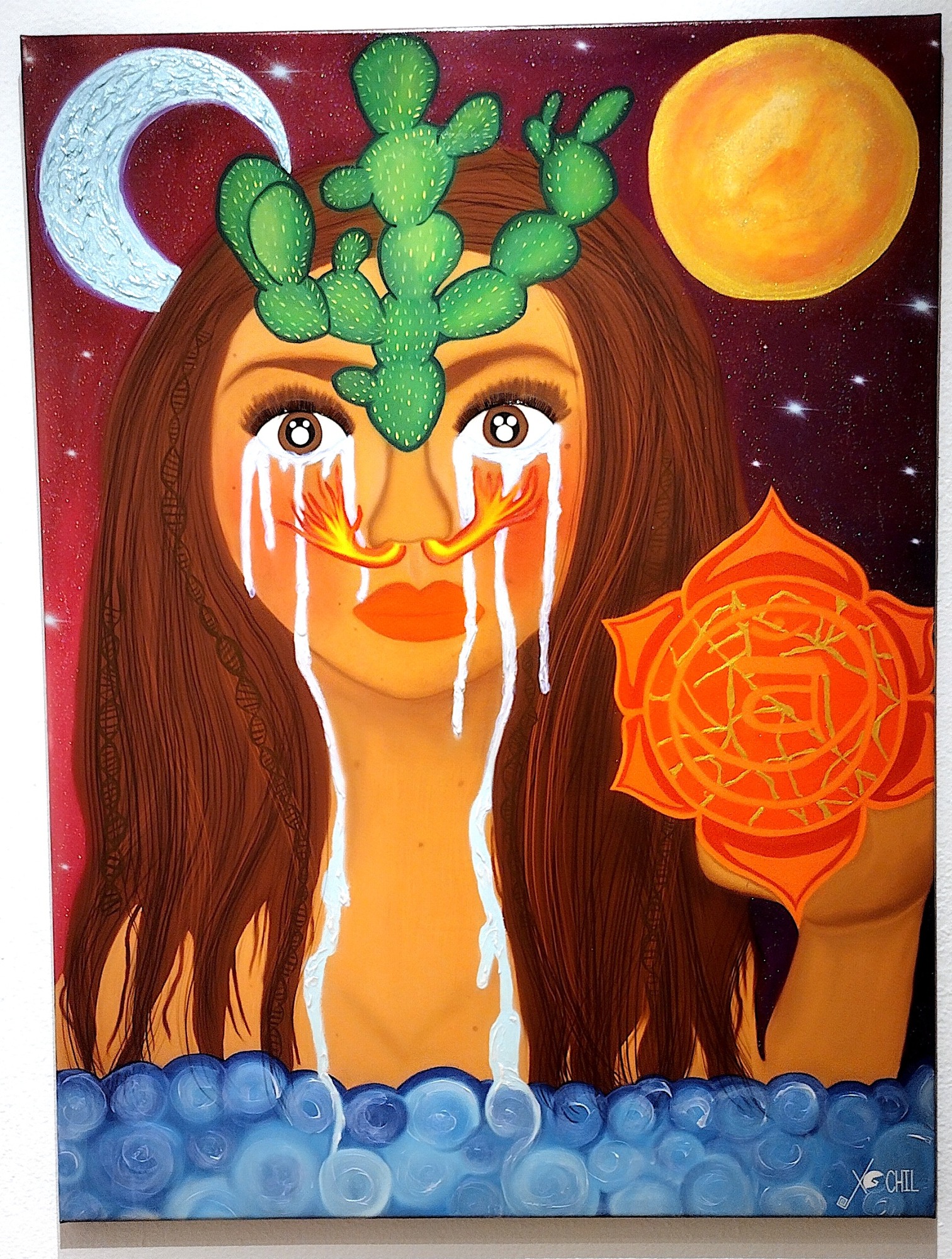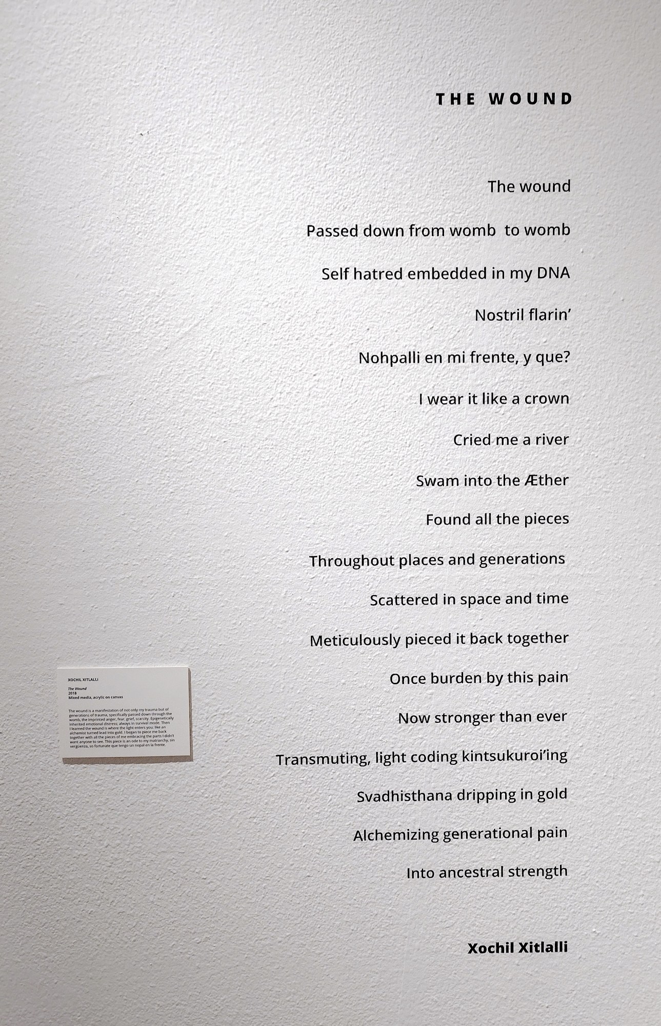The wound is a manifestation of not only my trauma but of generations of trauma, specifically passed down through the womb, the imprinted anger, fear, grief, scarcity. Epigenetically inherited emotional distress; always in survival mode. Then I learned the wound is where the light enters you: like an alchemist turned lead into gold. I began to piece me back together with all the pieces of me embracing the parts I didn’t want anyone to see. This piece is an ode to my matriarchy, sin vergüenza, so fortunate que tengo un nopal en la frente.