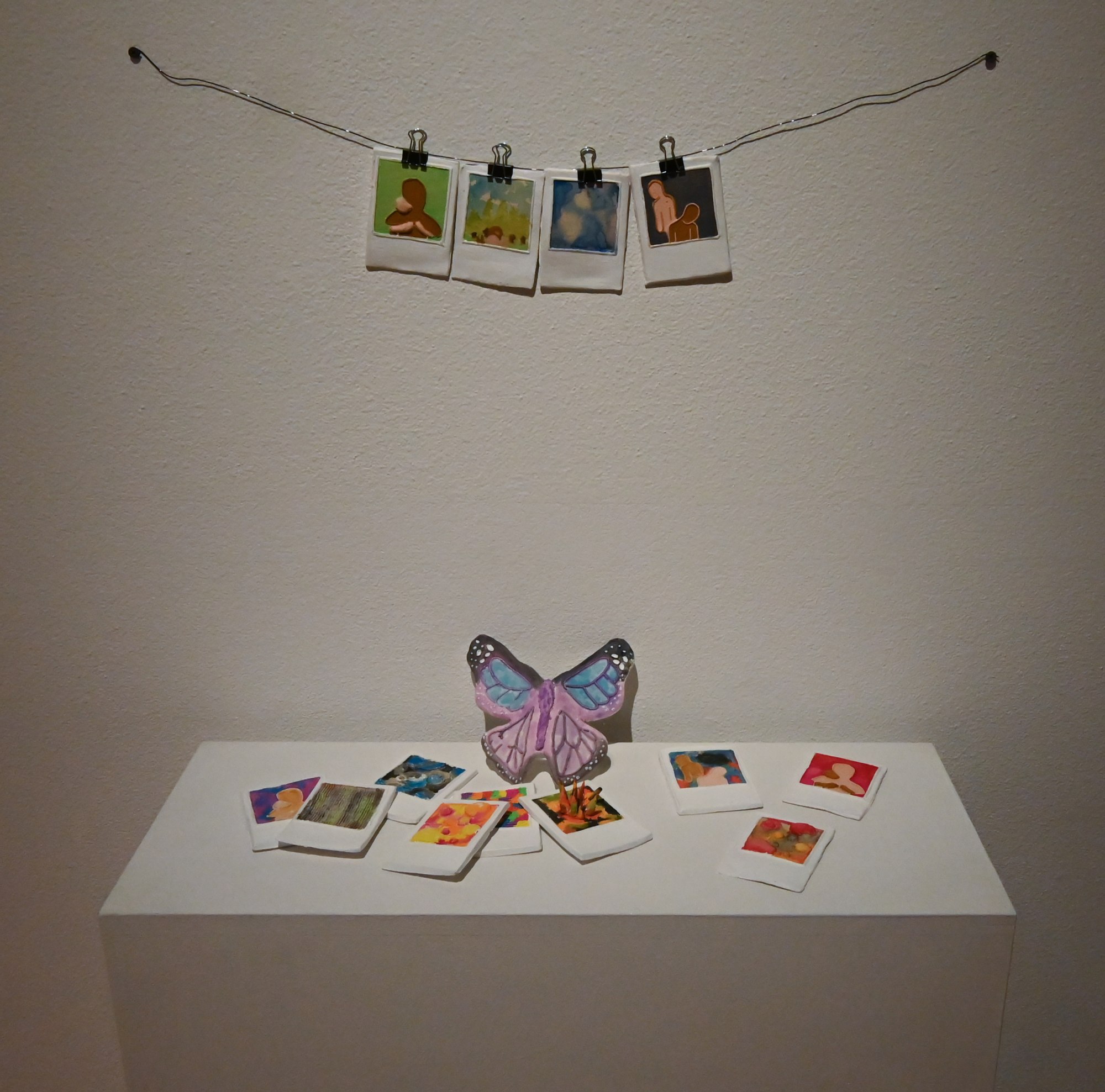 Item description: Several handmade tablets made to resemble white polaroids, some of the painted images are more figurative (depicting a beige and a brown figure either embracing or standing back-to-back) while others are more colorfully abstract. Most of the polaroids are scattered on a pedestal, accompanied by an upright butterfly in middle, while four select polaroids hang above across a wire.