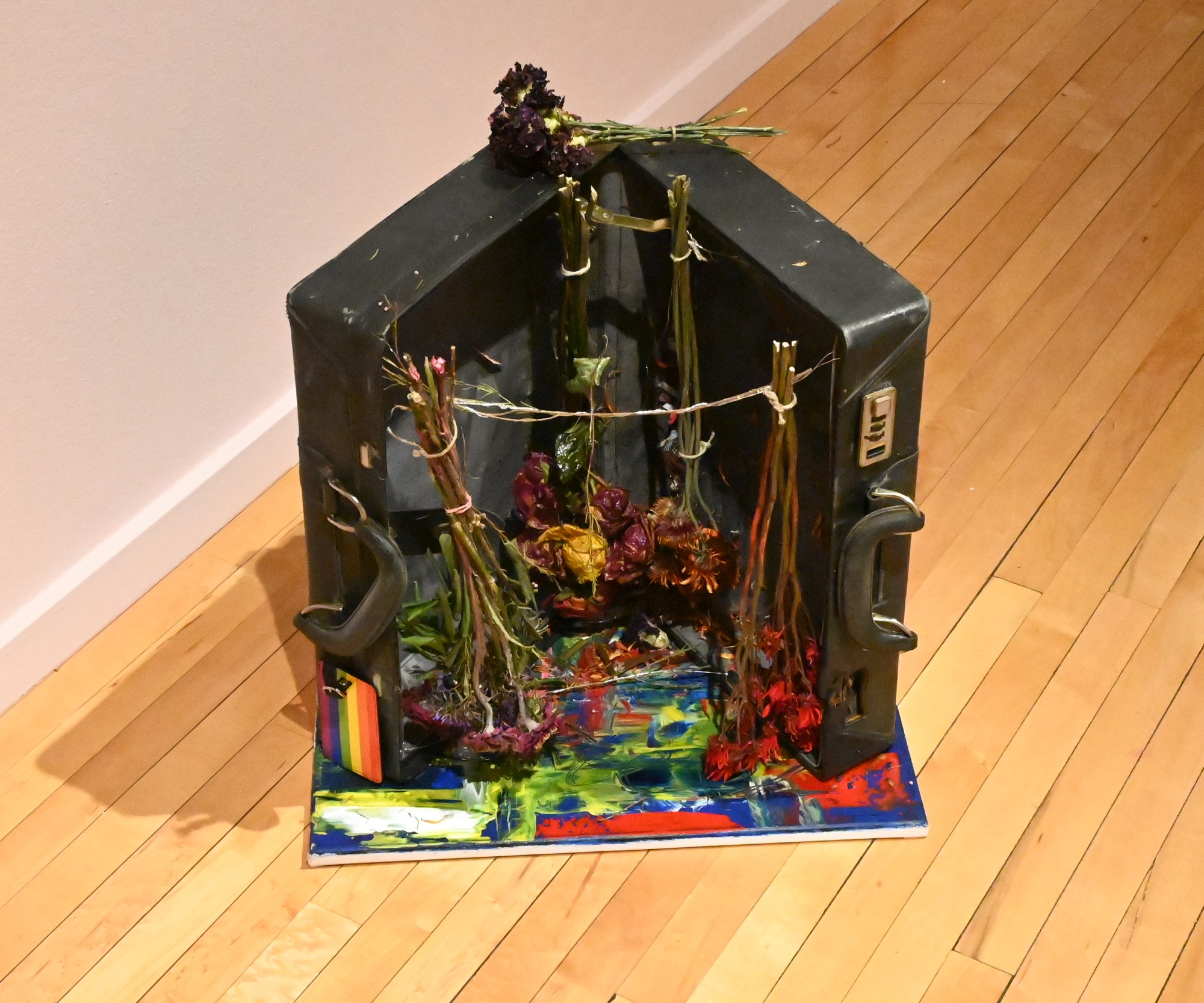 Item description: A half open black suitcase standing upright confined atop a canvas covered by smeared and vibrant paint; a small rainbow flag attached to its front. Four small dried bouquets hang upside down from between the suitcase's lids, and another lies on top.