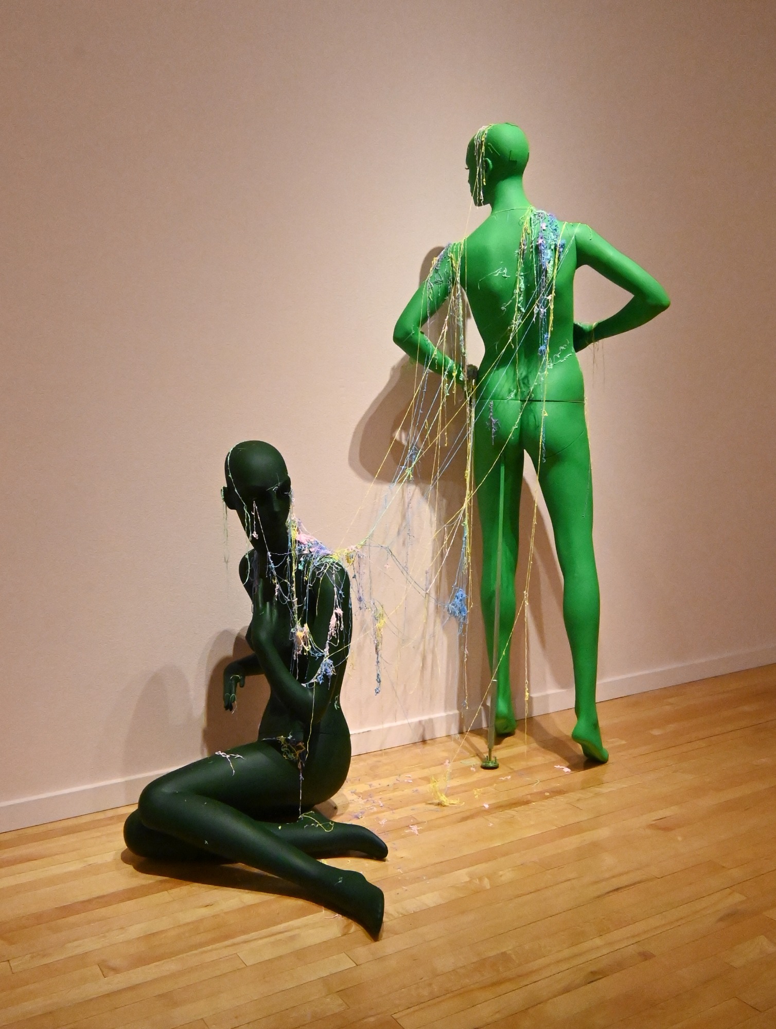 Item description: Two humanoid mannequins turned against each other; only a cacophony of Silly String swinging off their heads and shoulders connect the two. The mannequin on the left is deep green and faces the audience, crouched on its knee with a hand to its collarbone. The other mannequin is bright green and stands leaning on its toes and hands on its waist.