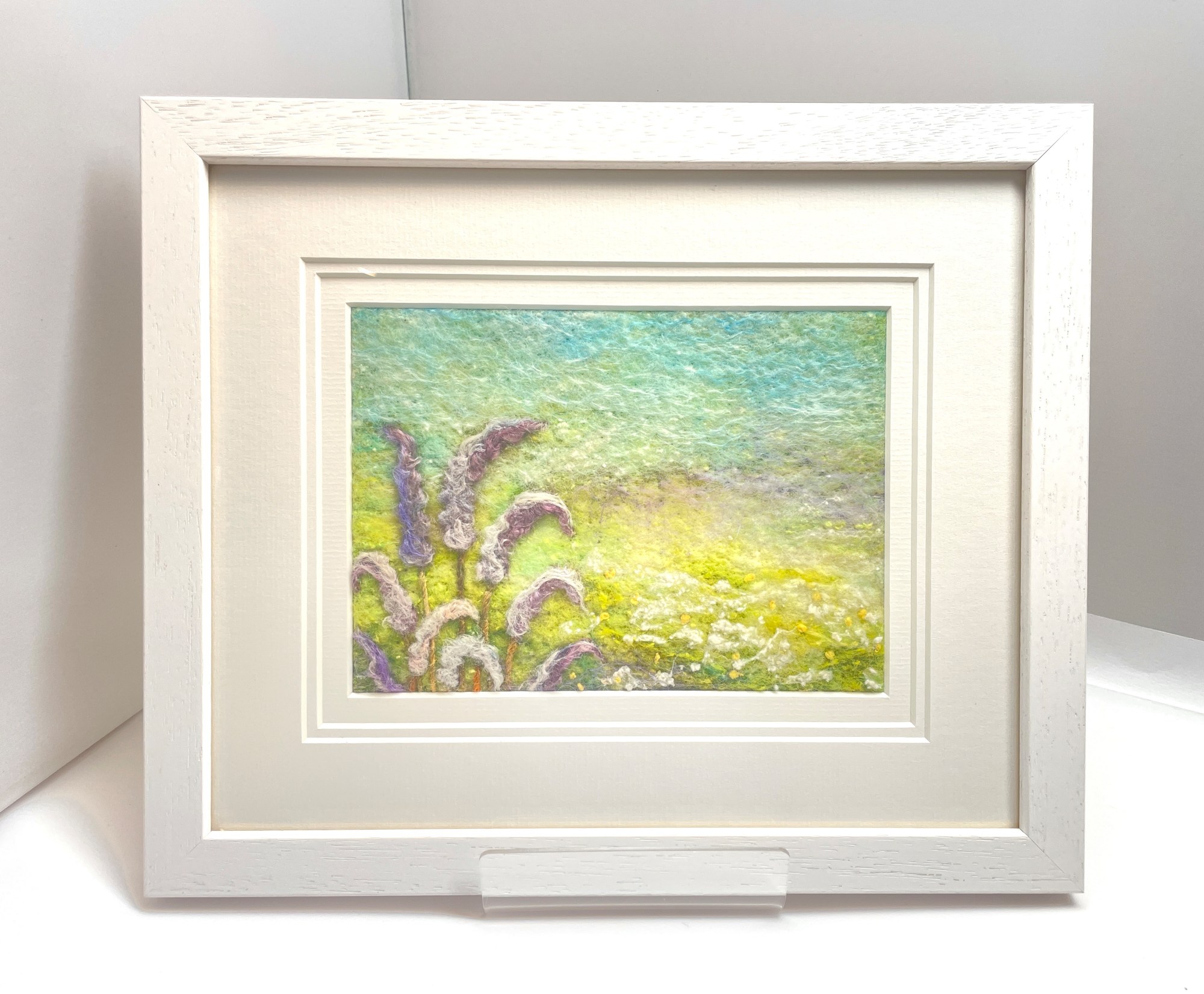 Skilfully crafted from fibre materials such as wool and silk in various forms, this charming original textile artwork features a vibrant and colorful composition with intricate and lively botanical forms. The piece is meticulously brought to life using just needle felt techniques with no glue or stitches.