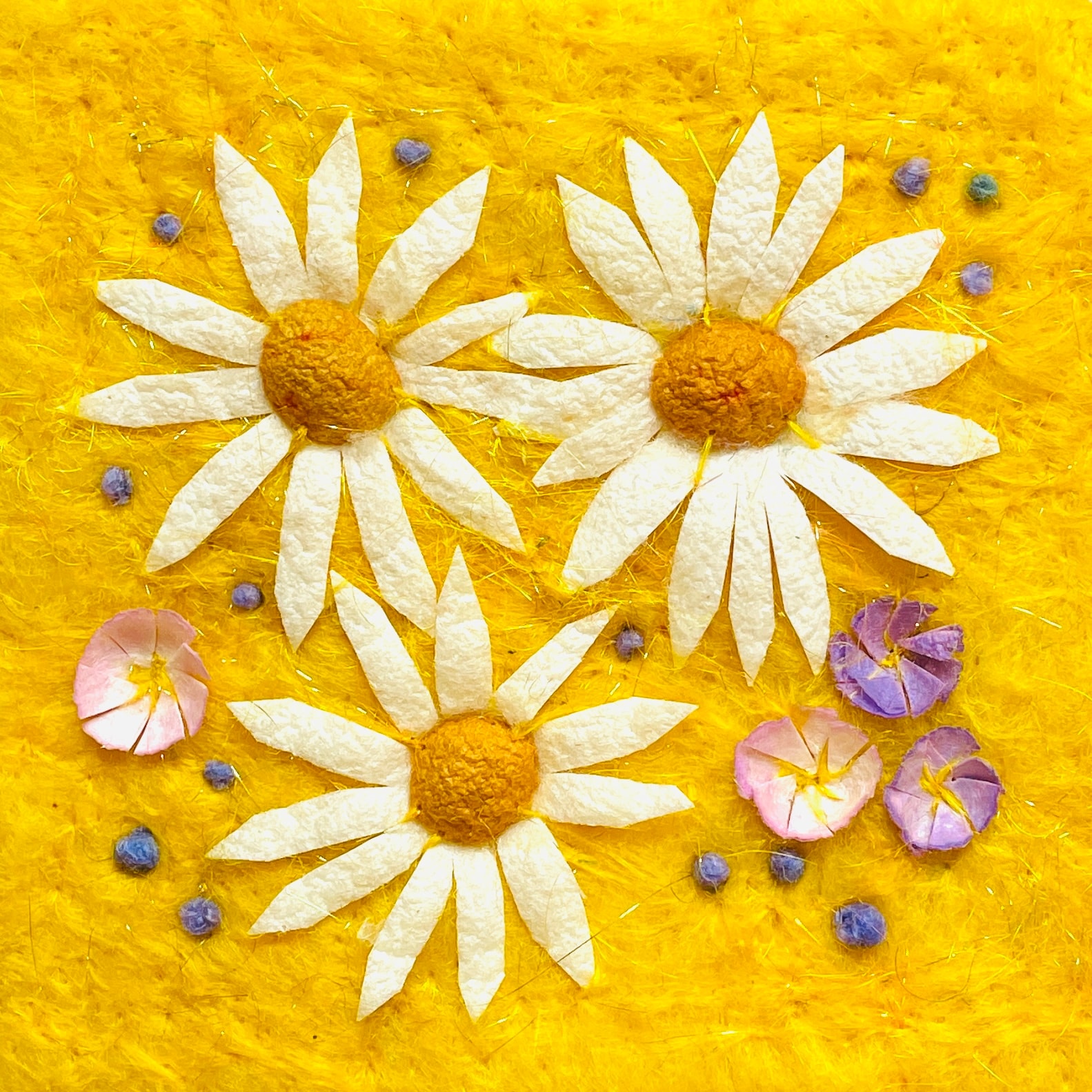 Skilfully crafted from fibre materials such as wool and silk in various forms, this charming original textile artwork features a vibrant and colorful composition with intricate and lively botanical forms. The piece is meticulously brought to life using just needle felt techniques with no glue or stitches.