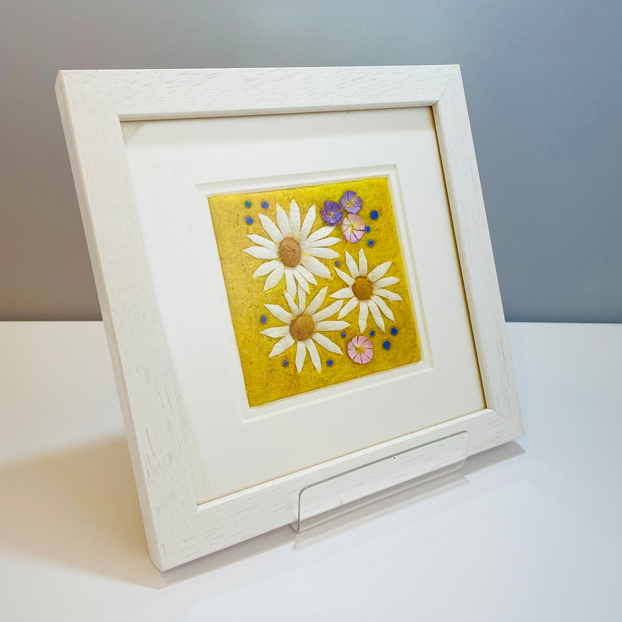 Mounted on to board using archival micro fasteners and presented in a glazed handmade wood frame, painted contemporary white.