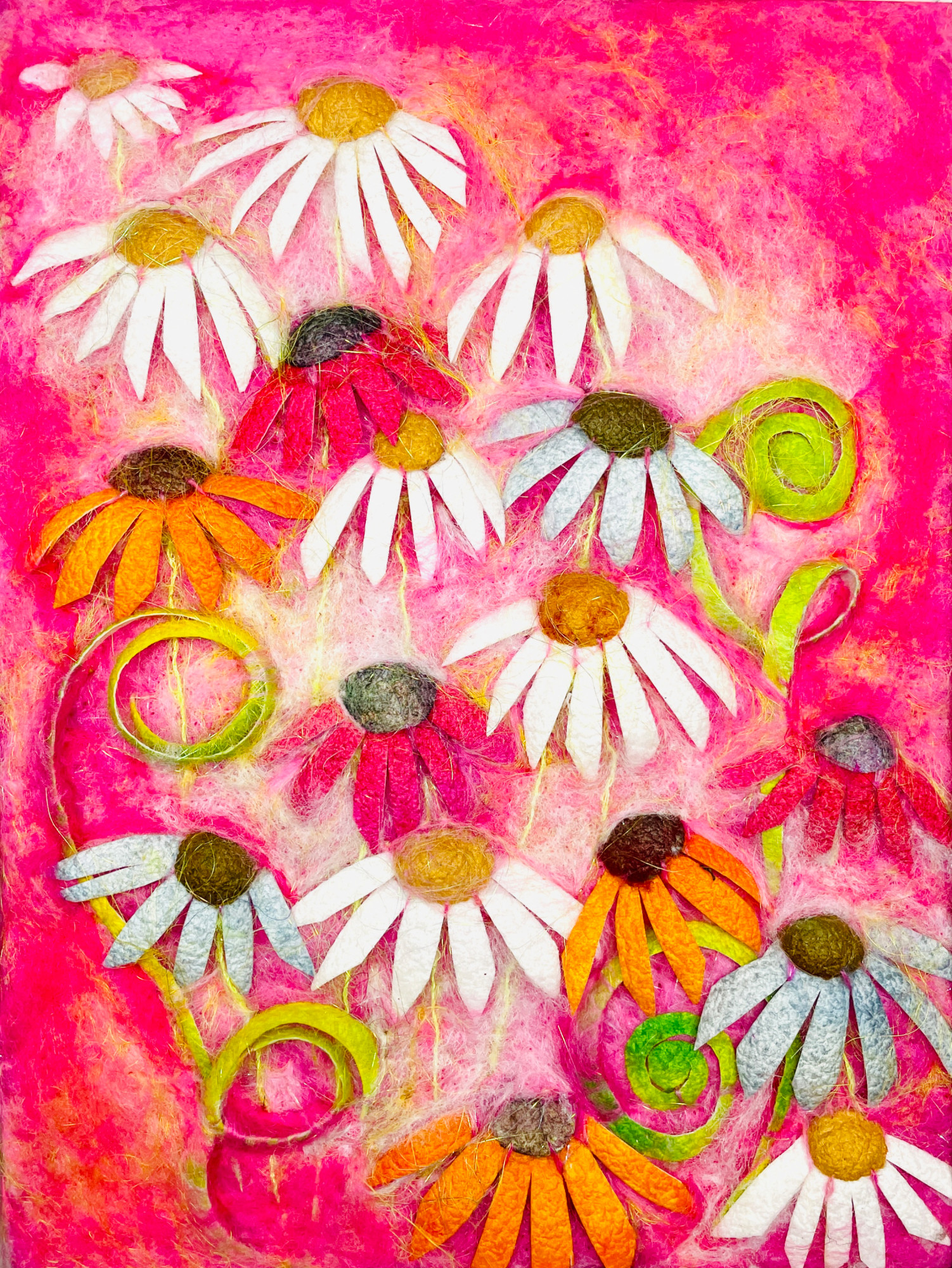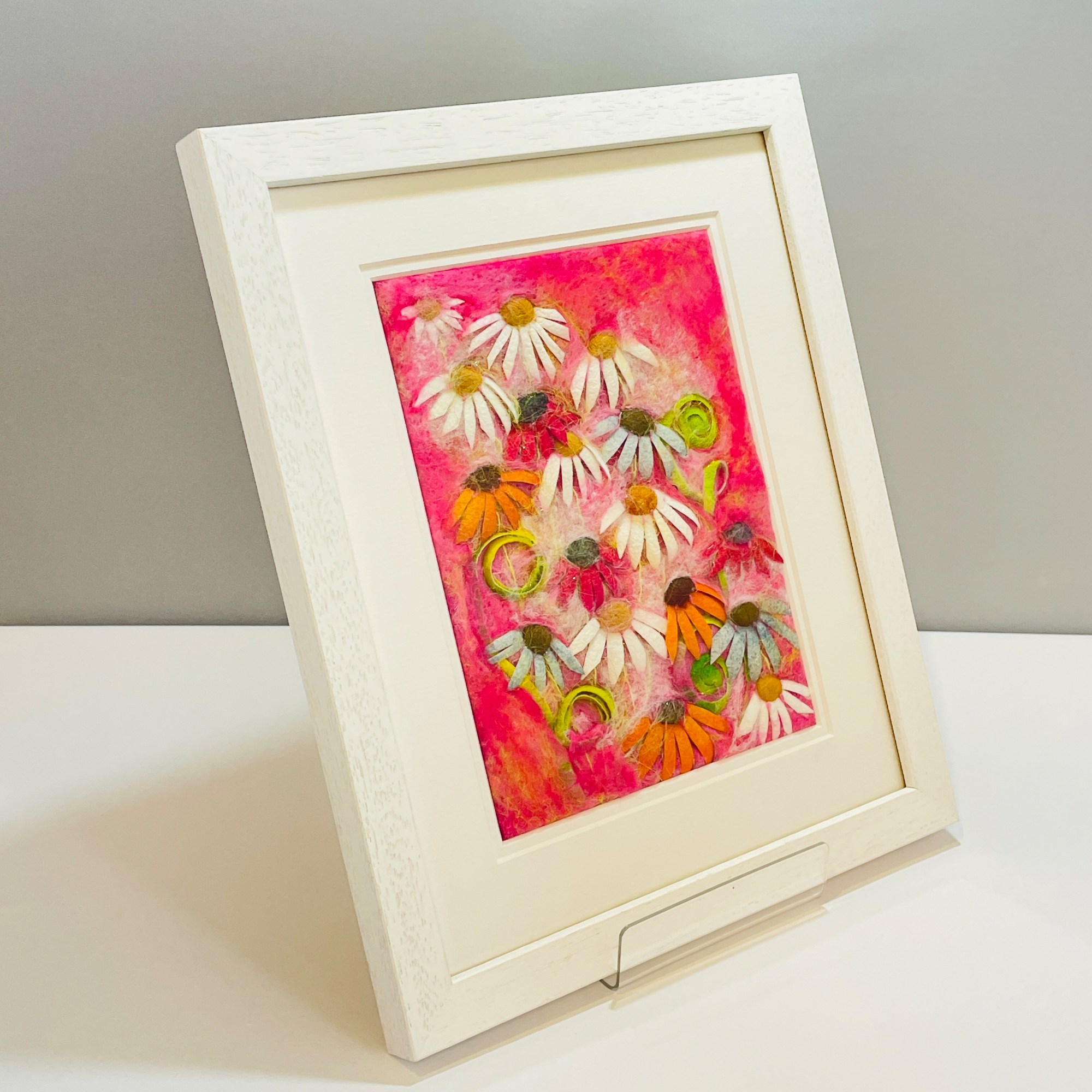 Skilfully crafted from fibre materials such as wool and silk in various forms, this charming original textile artwork features a vibrant and colorful composition with intricate and lively botanical forms. The piece is meticulously brought to life using just needle felt techniques with no glue or stitches.