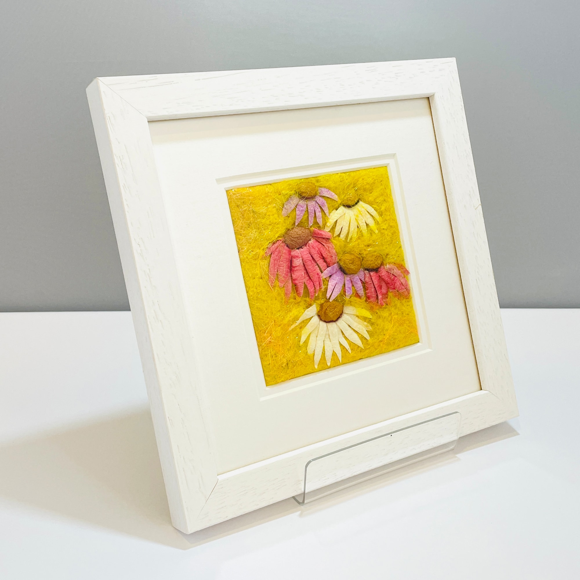 Mounted on to board using archival micro fasteners and presented in a glazed handmade wood frame, painted contemporary white.