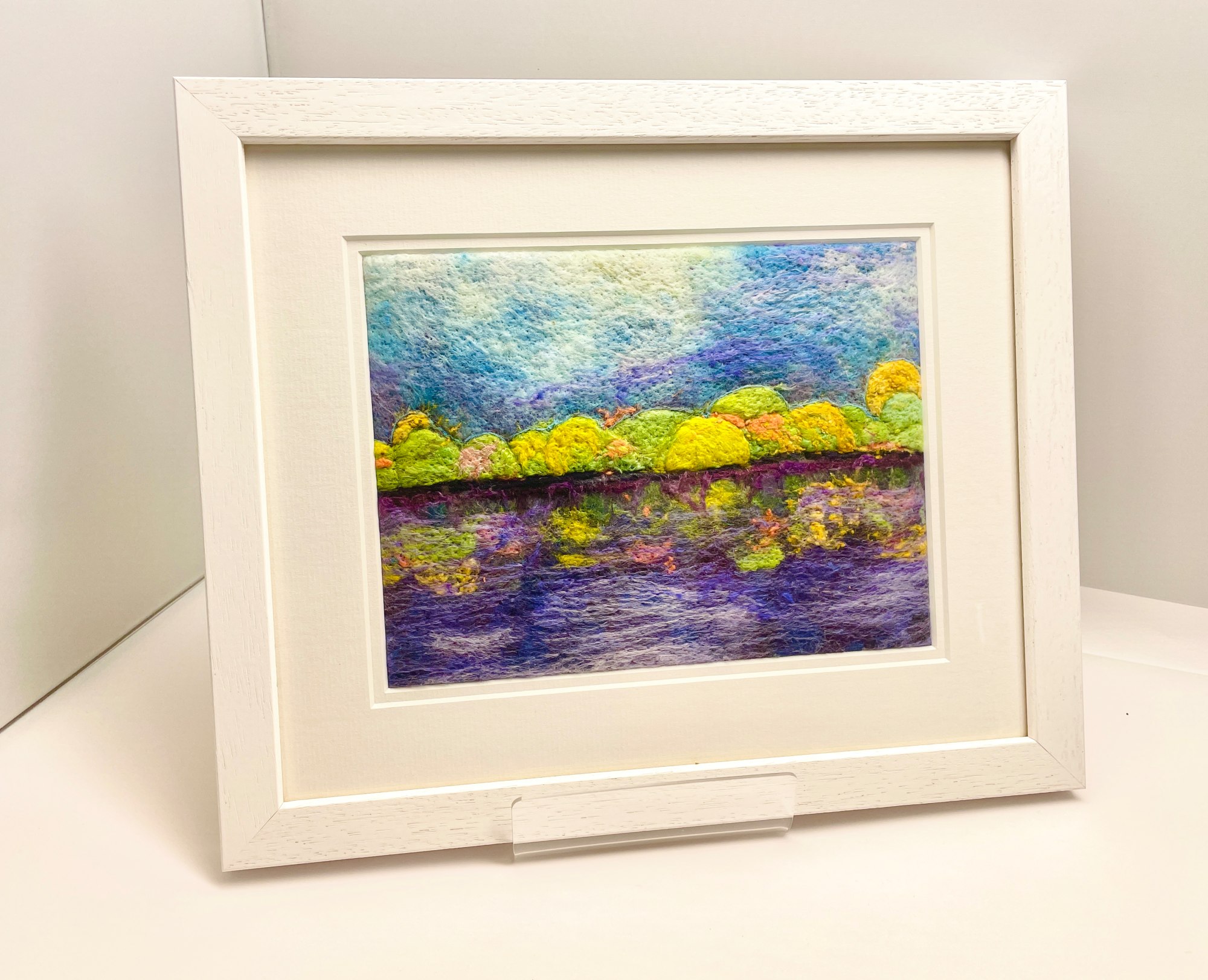 Skilfully crafted from fibre materials such as wool and silk in various forms, this charming original textile artwork features a vibrant and colorful composition with intricate and lively botanical forms. The piece is meticulously brought to life using just needle felt techniques with no glue or stitches.