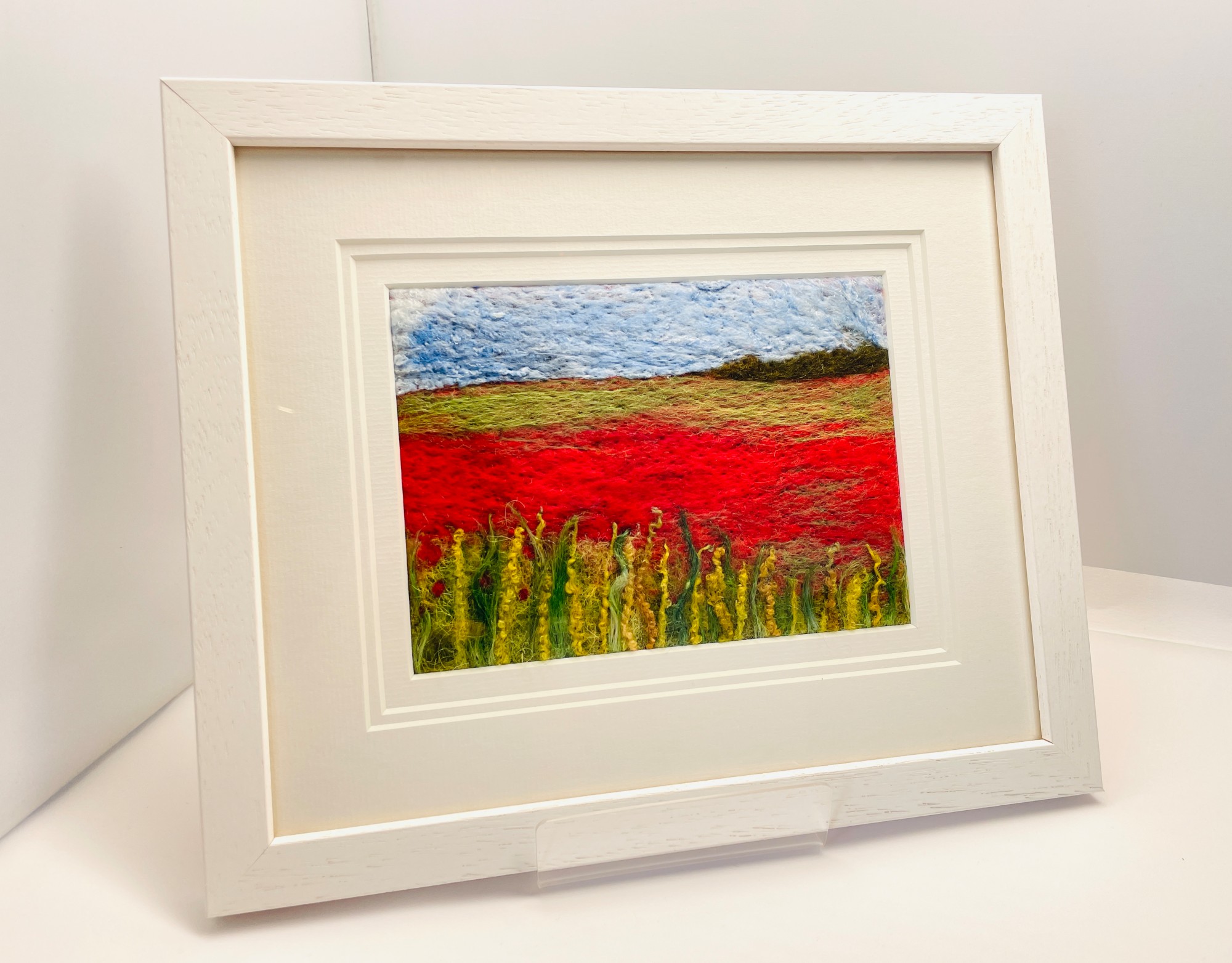 Skilfully crafted from fibre materials such as wool and silk in various forms, this charming original textile artwork features a vibrant and colorful composition with intricate and lively botanical forms. The piece is meticulously brought to life using just needle felt techniques with no glue or stitches.