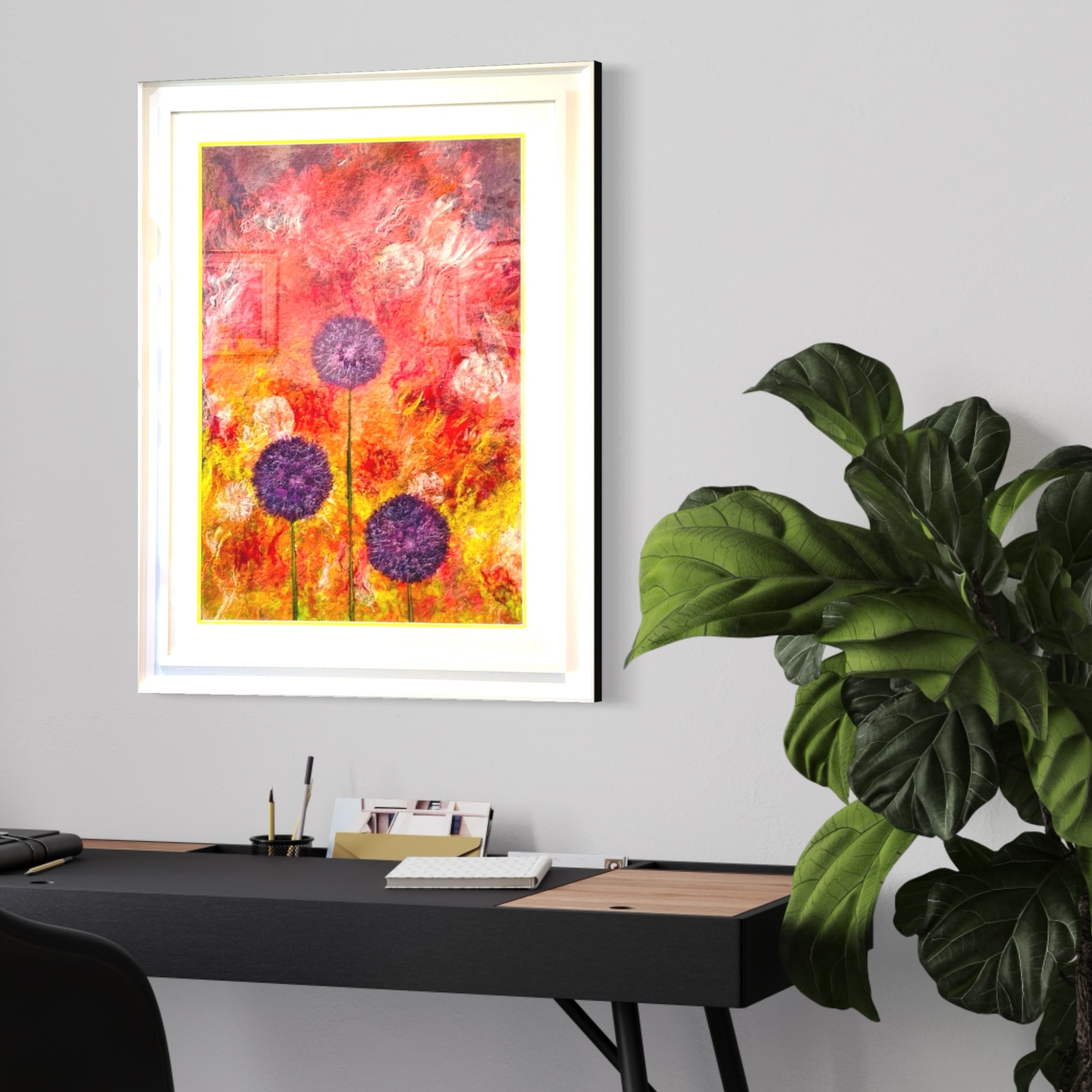 This piece depicts the energy, strength and resilience that arrives with spring. The phoenix provides the theme of flames, feathers and wings with the allium showing strength, patience and abundance.