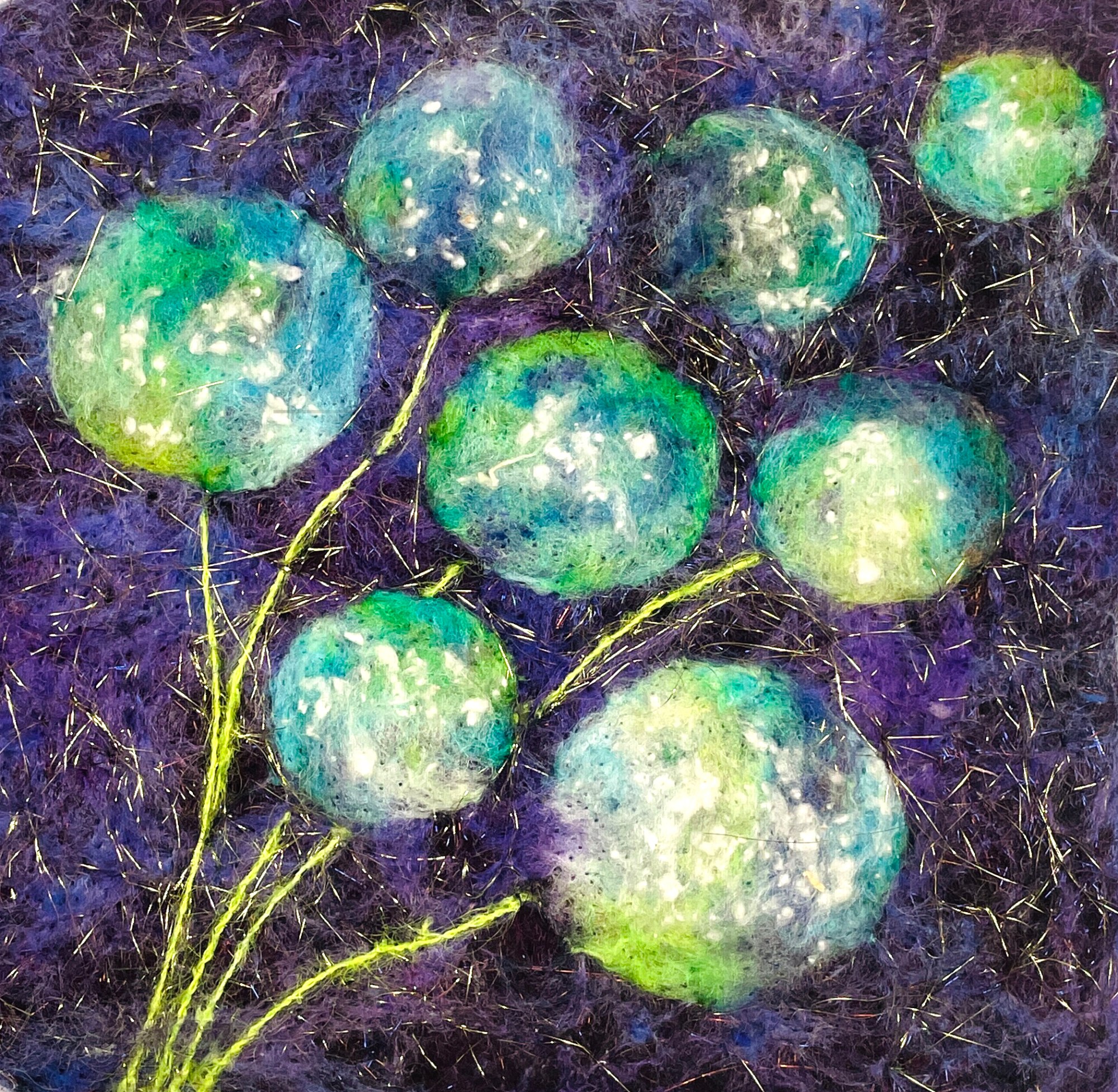 Skilfully crafted from fibre materials such as wool and silk in various forms, this charming original textile artwork features a vibrant and colorful composition with intricate and lively botanical forms. The piece is meticulously brought to life using just needle felt techniques with no glue or stitches.