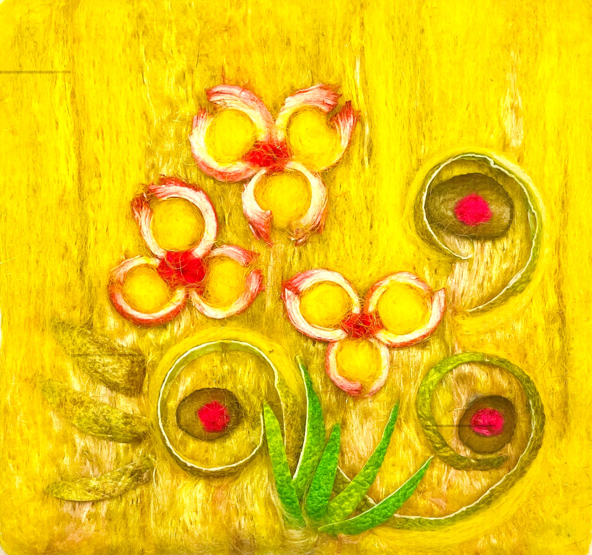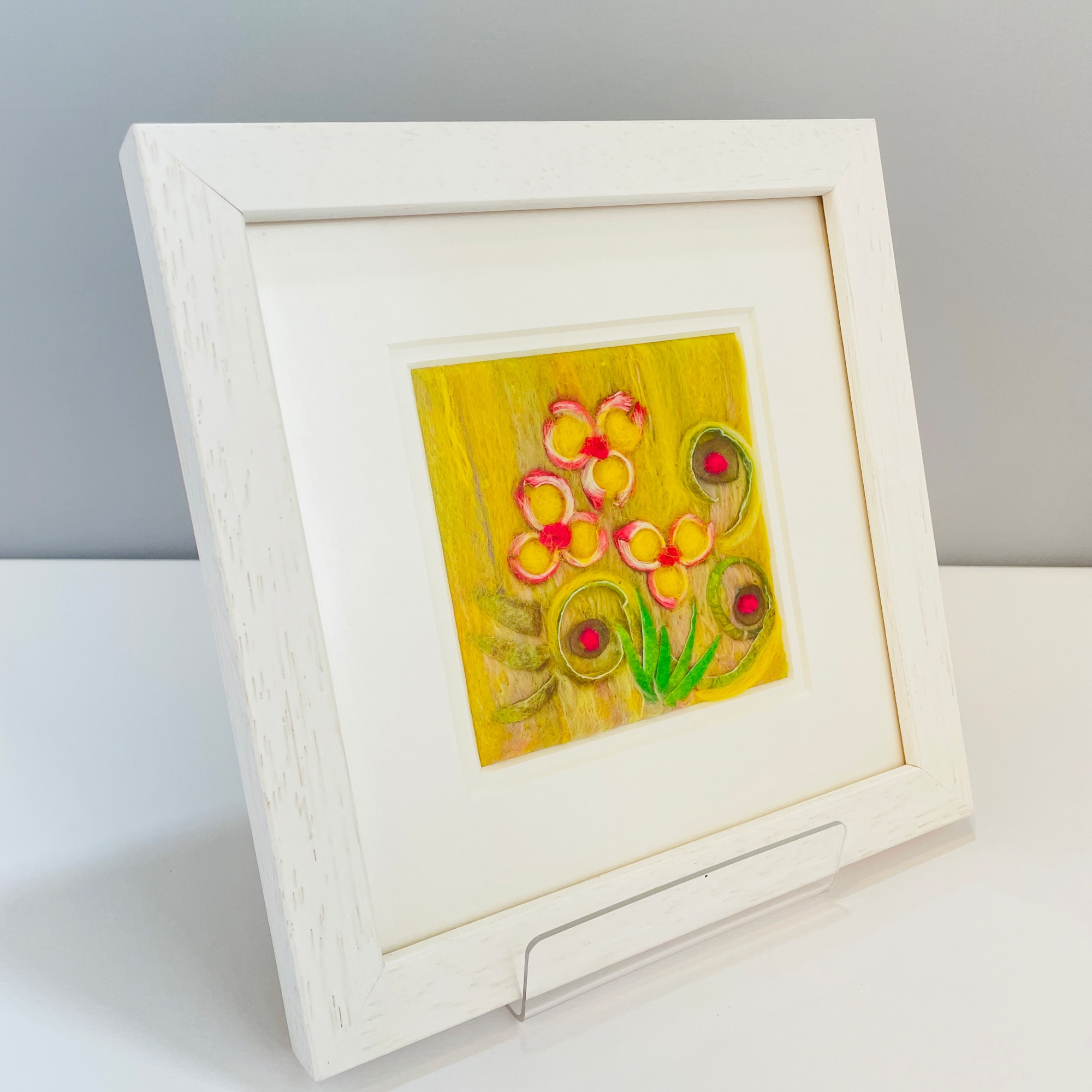 Skilfully crafted from fibre materials such as wool and silk in various forms, this charming original textile artwork features a vibrant and colorful composition with intricate and lively botanical forms. The piece is meticulously brought to life using just needle felt techniques with no glue or stitches.