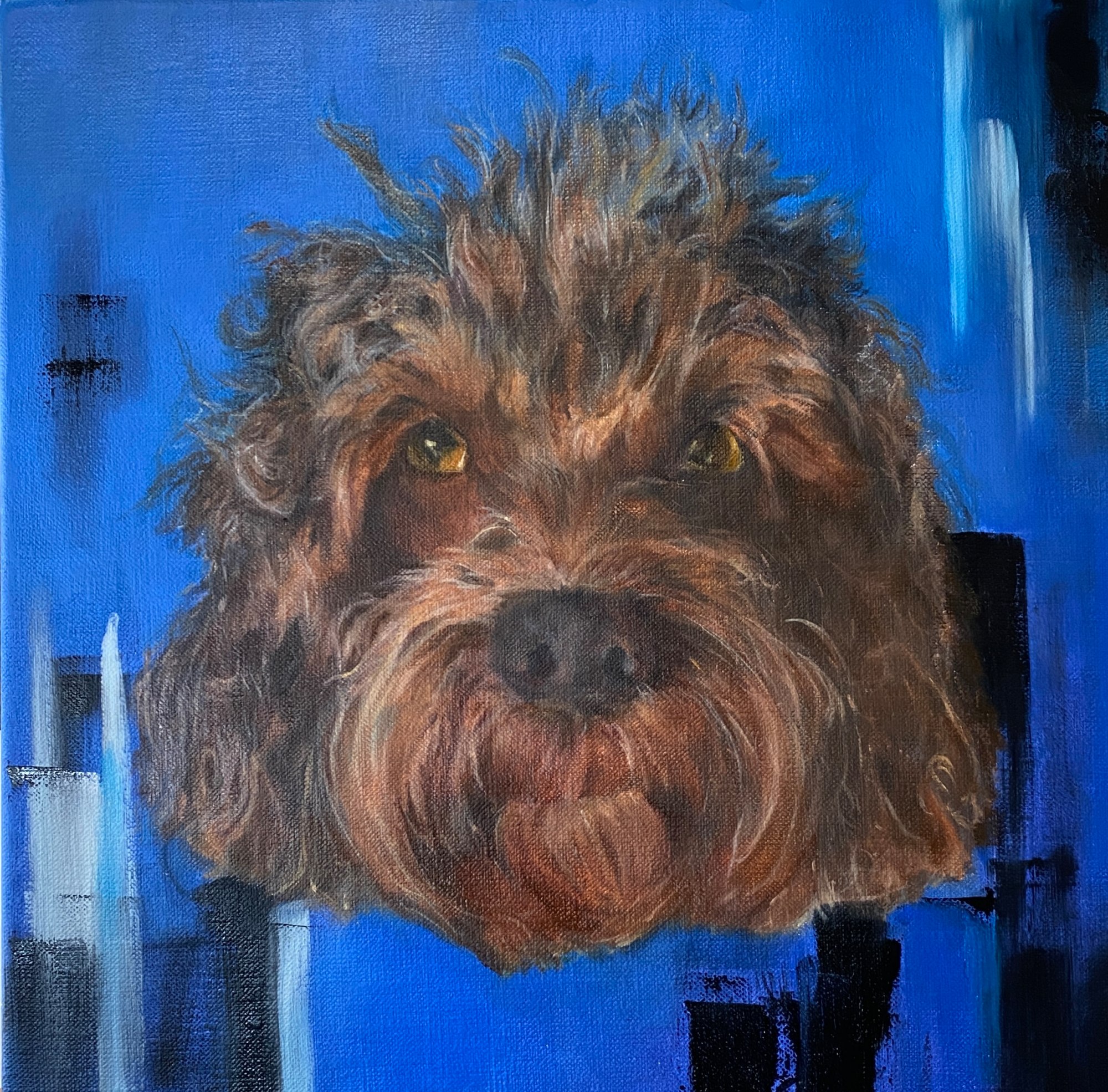 I met this fluffy ball of energy owned by two kids who were always playing with him. His playful antics and adorable fluffy fur inspired me to create a painting that captured his lively personality. I wanted to convey the fun and joy he brought to the family, so I incorporated bold colours and playful brushstrokes. The end result was a painting that radiated the same happy-go-lucky spirit as the fluffy pup that had inspired it.