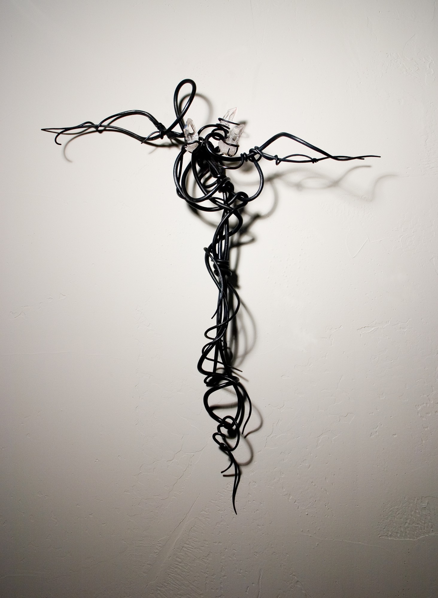 Hot forged steel with quartz crystals; as a wall piece it has a single loop point of mounting.