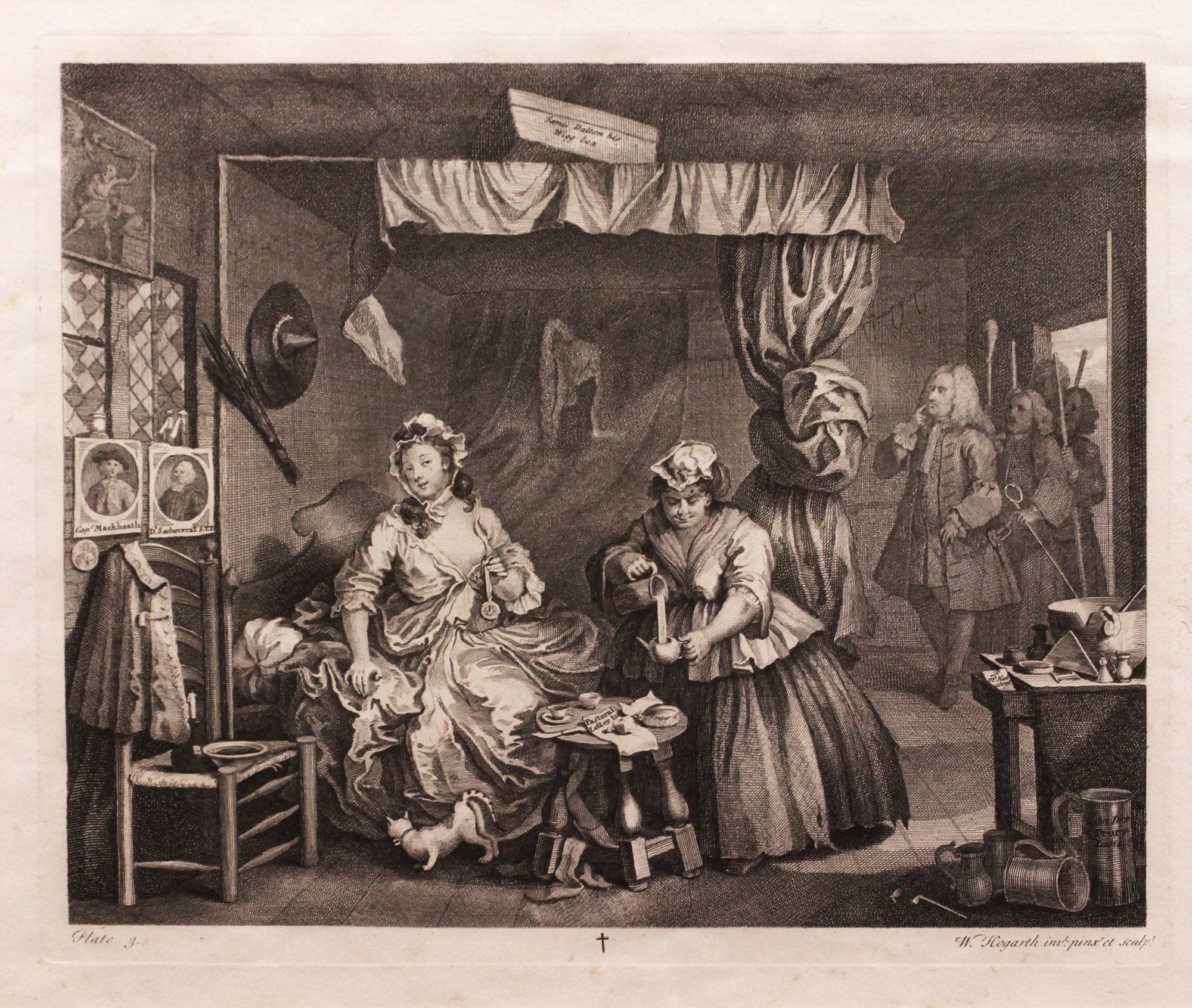 Moll, in a reduced state, takes tea while bailiffs enter her lodgings