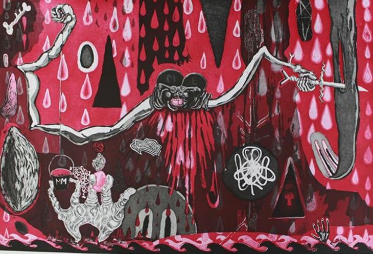 Hancock creates prints, drawings, and collaged felt paintings that are often themed around the battle between good and evil--an exploration that originated from his upbringing as the stepson of a Baptist minister.
