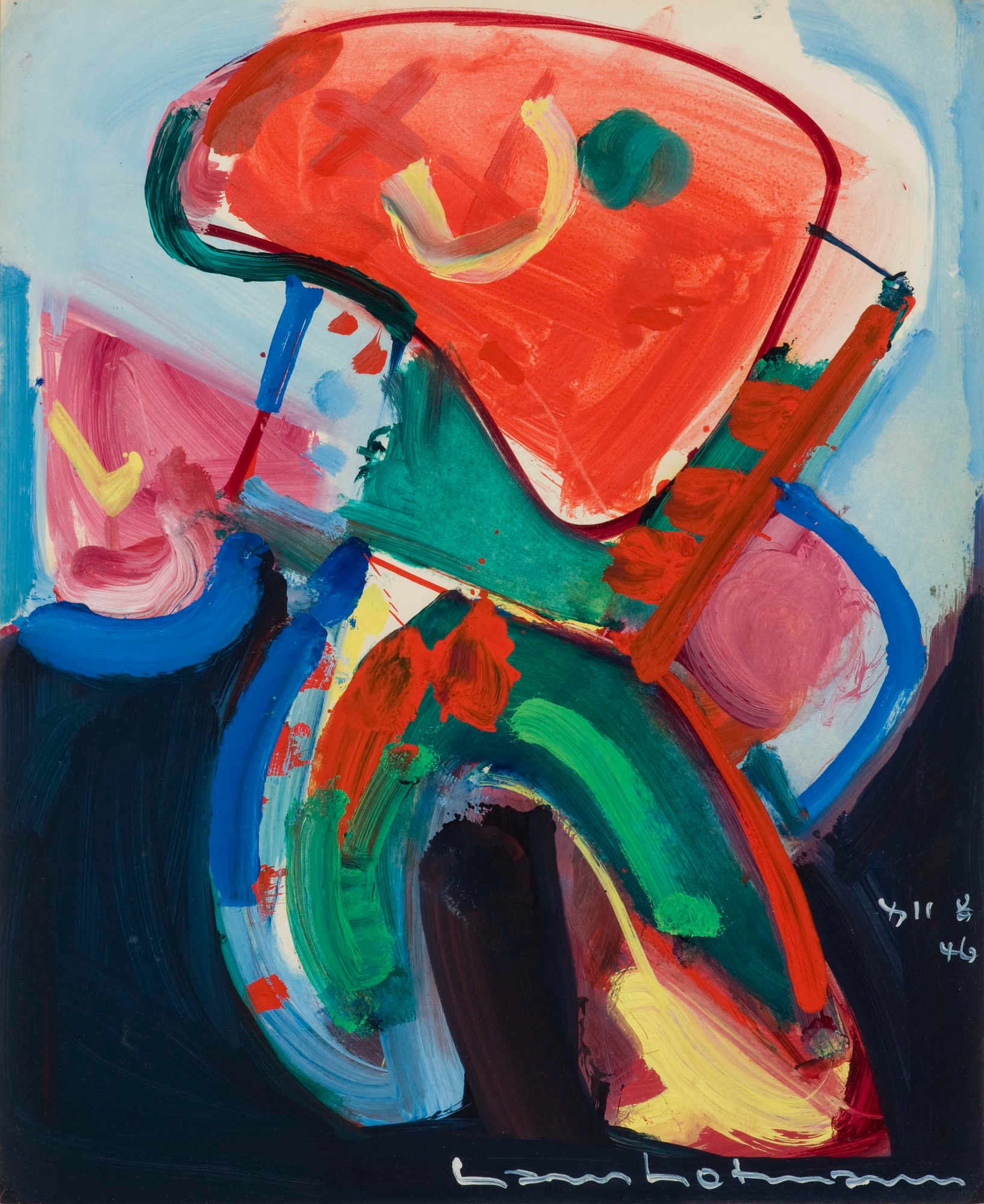 Living in Germany in the beginning of the 20th century, Hofmann’s early style synthesized modernist movements like Fauvism, Cubism, and Symbolism. Later in his painting career, he developed a style of pure abstraction expressionism concerned with unity, shape, experimentation, and primary colors to create “action painting,” a term used by many such as Jackson Pollock and influential critic Clement Greenberg by the end of the 1950s. Not only was Hofmann a renowned artist, but also an important teacher to a number of postwar artists, especially in the realm of abstract expressionists. This gouache work completed in 1946, characterized by its bold, thick strokes of vivid paint, are evidence of Hofmann’s newly developed expressive style that greatly influenced postwar European and American art.