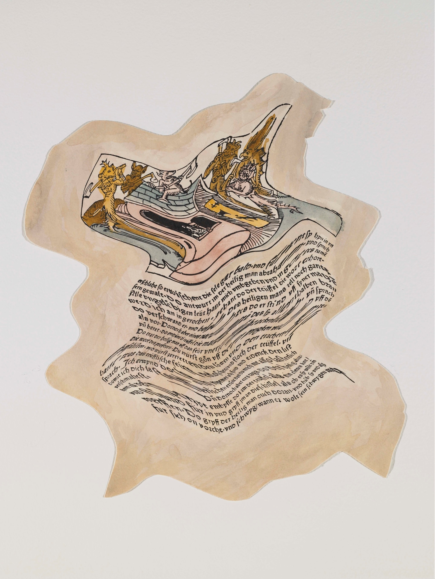In the winter of 2006, several of Robert Lazzarini’s works on paper were displayed here at Davidson College. During his visit, Lazzarini digitally manipulated a 15th century woodcut entitled "A House Beleaguered by Devils," c. 1482, (Accession Number 2340) to make three new pieces, Untitled I-III. All four pieces, including the original, feature Old German text from Hieronymous’s Leben der Heiligen Altväter.