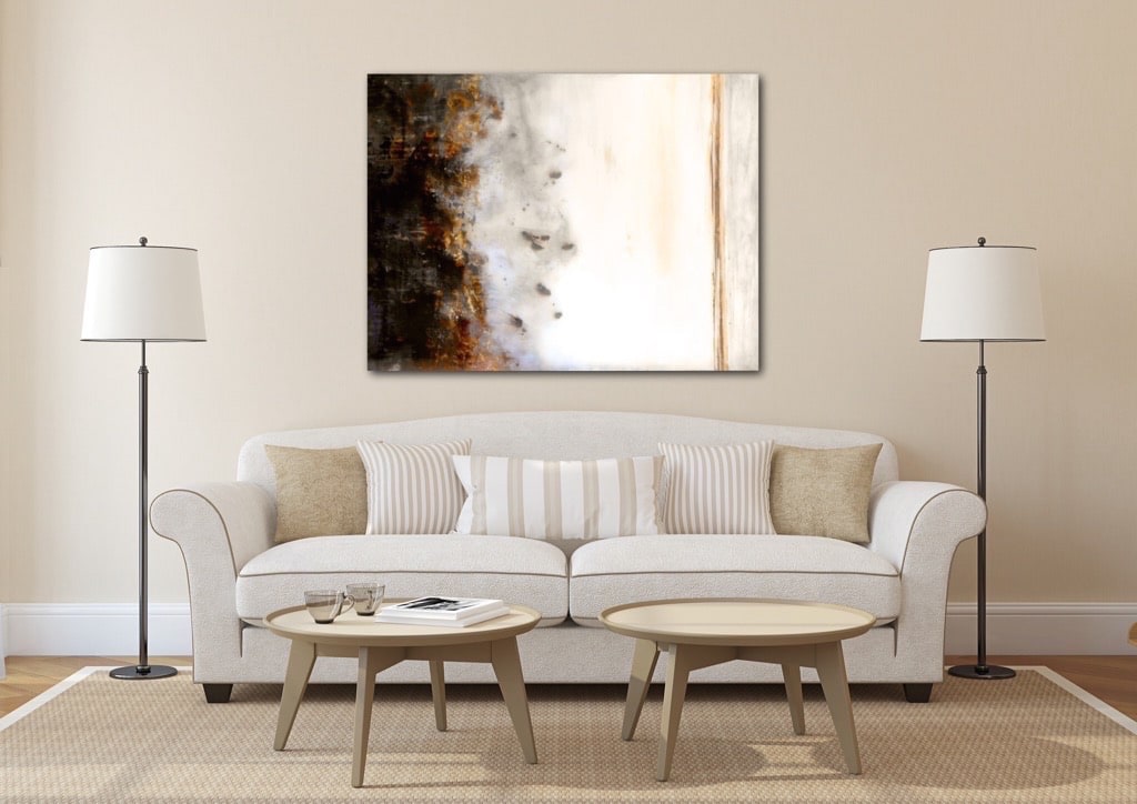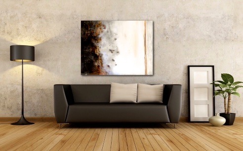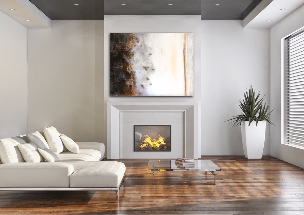 Acrylic and gold leaf finished with poured resin. Sides painted to match so no frame necessary.