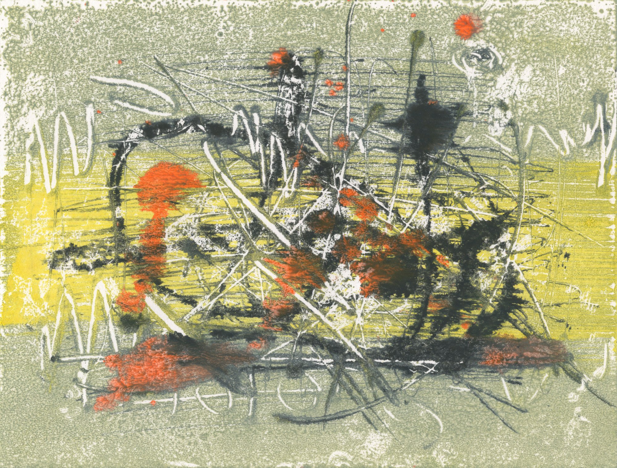 Monotype on paper, mounted on wood panel and covered with epoxy resin.