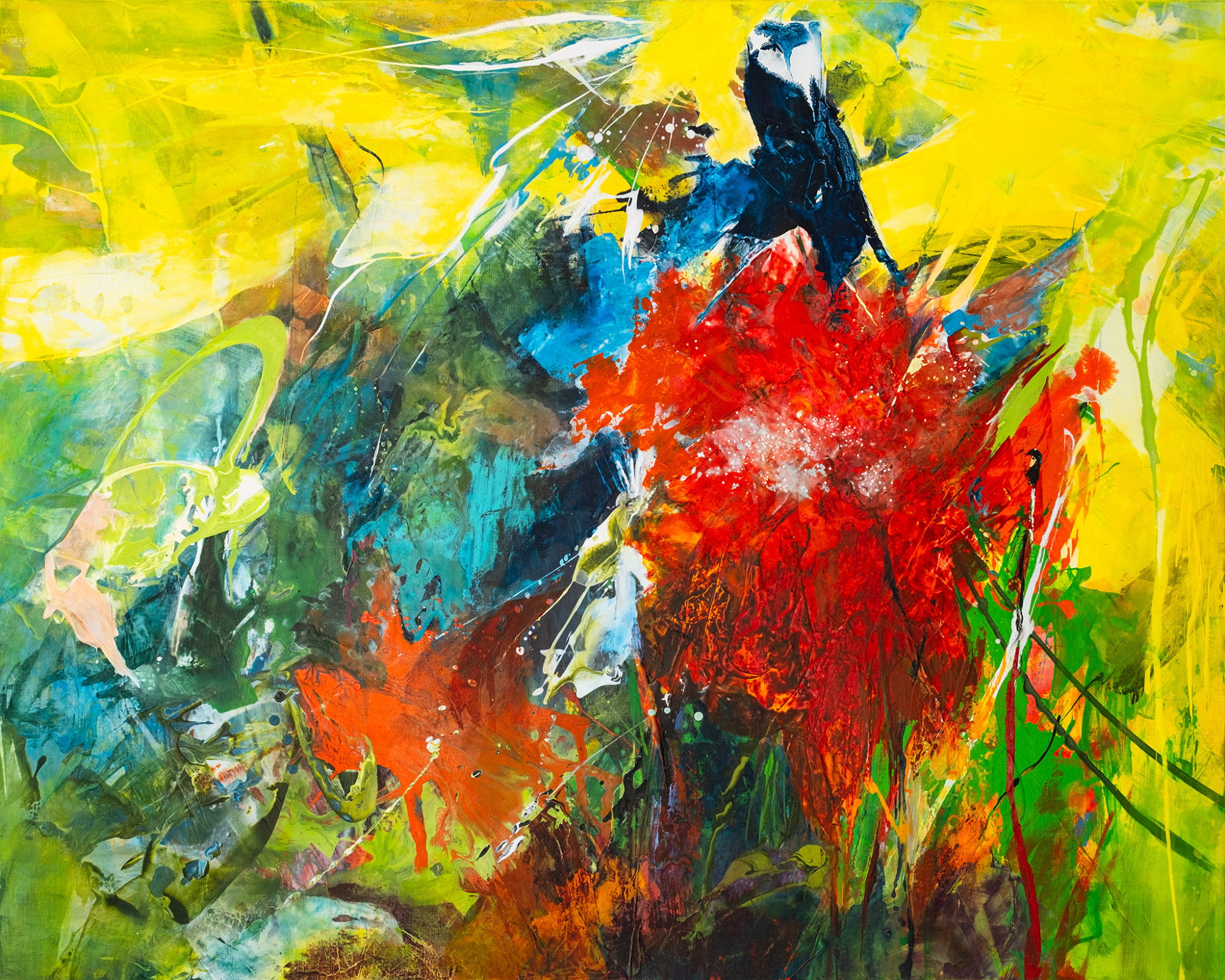 Eine abstrakte Mohnblume im vollen Sonnenlicht in lebendigem Rot. Intensive Freude, strahlende Zuversicht und eine umhüllende Wärme entsteht beim Betrachten.
