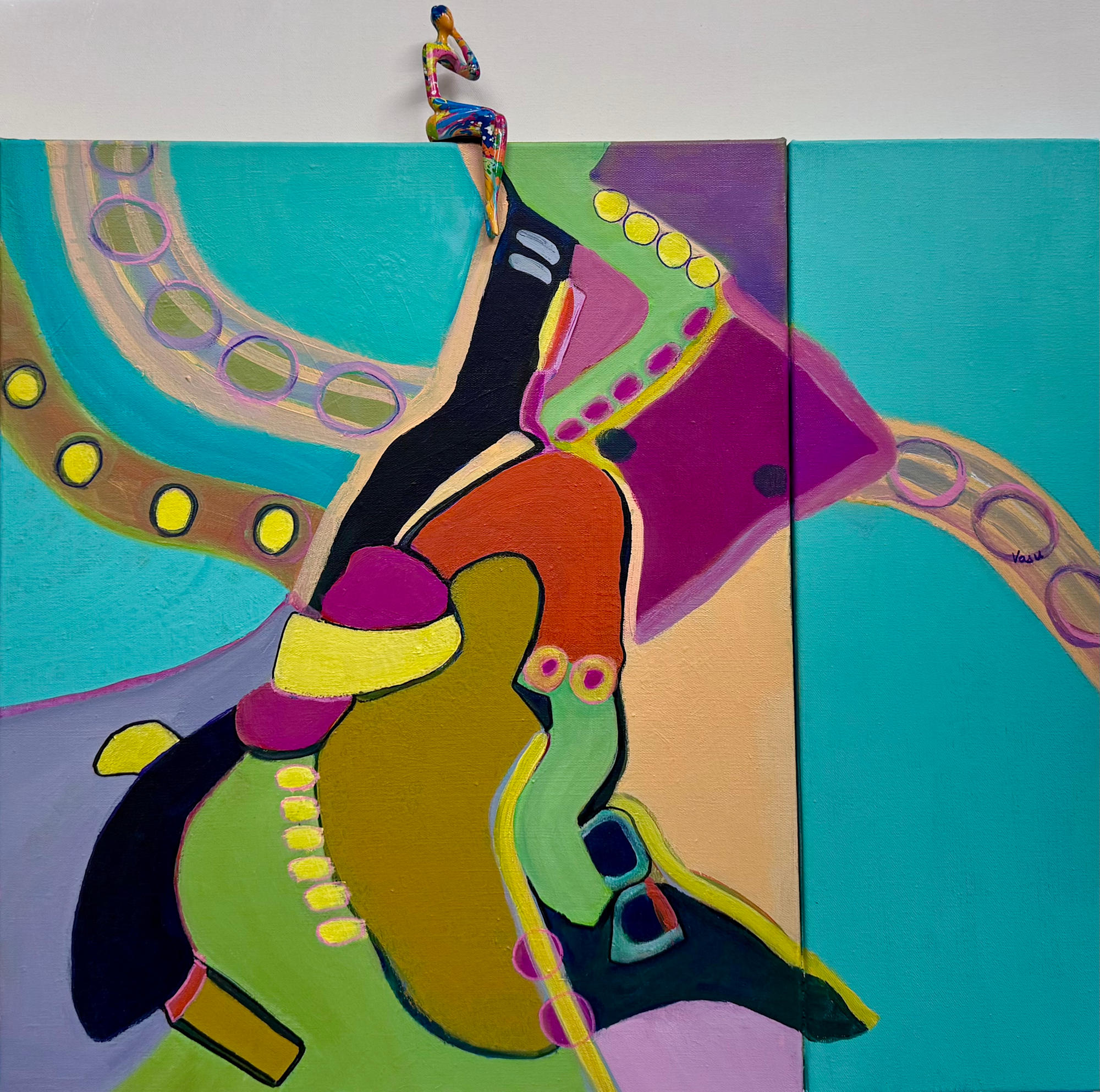 A lone figure perches above a dynamic sweep of colors, balancing on the edge between order and motion. The golden circles and flowing arcs suggest life’s currents, while the figure gazes calmly outward, embodying resilience amid change. The turquoise expanse provides a meditative contrast, inviting reflection on balance and perspective.