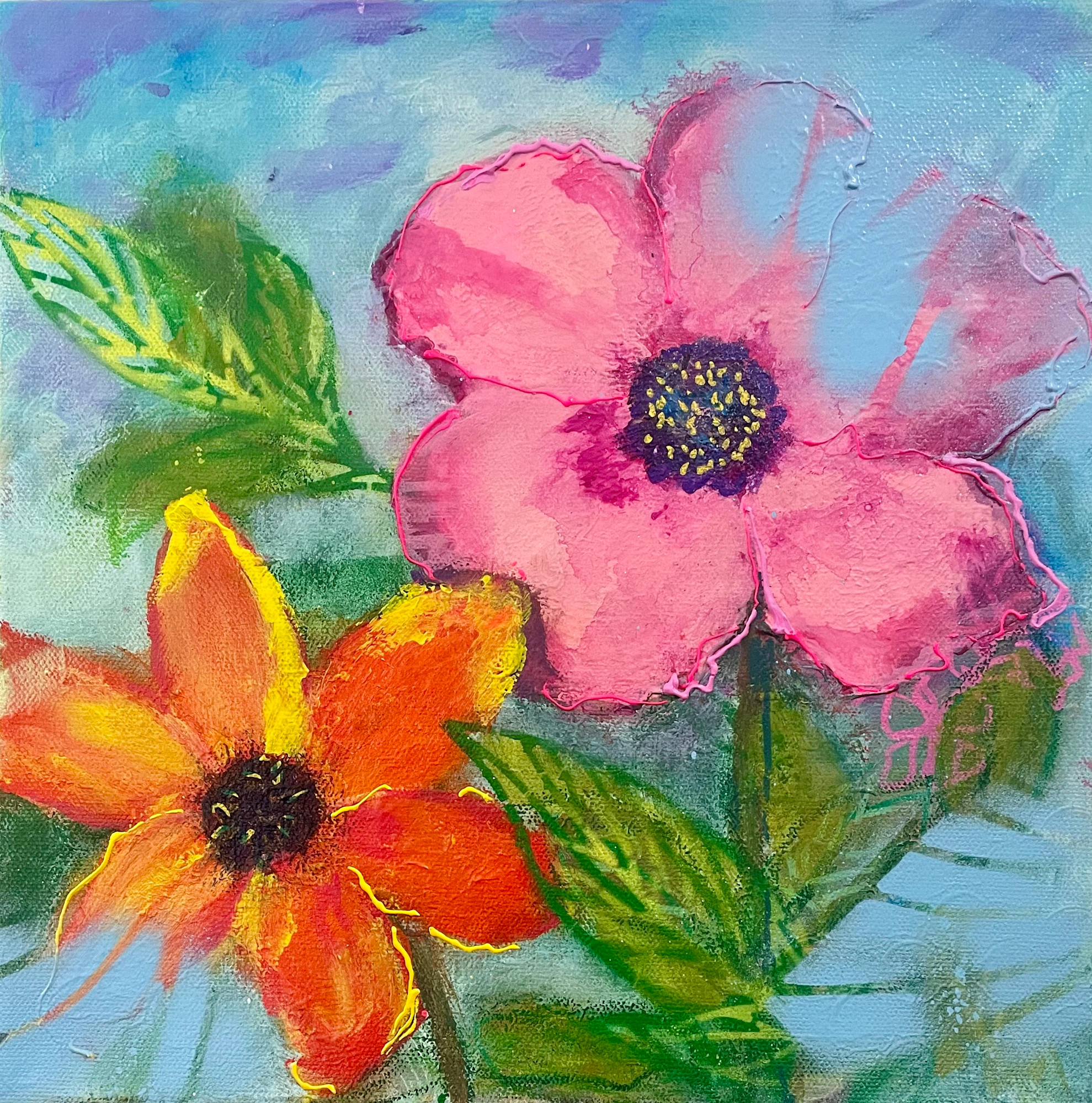 Mixed media floral work combining painted elements with varied textures, featuring a large pink bloom and orange flower against a blue background. The piece shows different technique while maintaining beautiful color harmony.