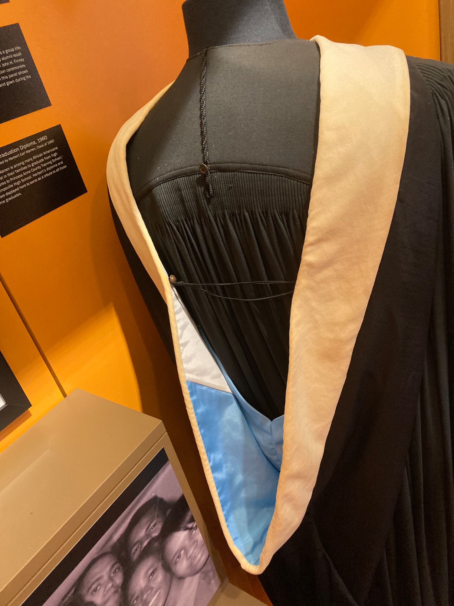 Black, ivory, white, and light blue polyester graduation hood worn and owned by John H. Finney at the Union Kempsville High School graduation ceremonies for 1963, 1964, and 1965. Mr. Finney taught History and Civics at Union Kempsville High School.