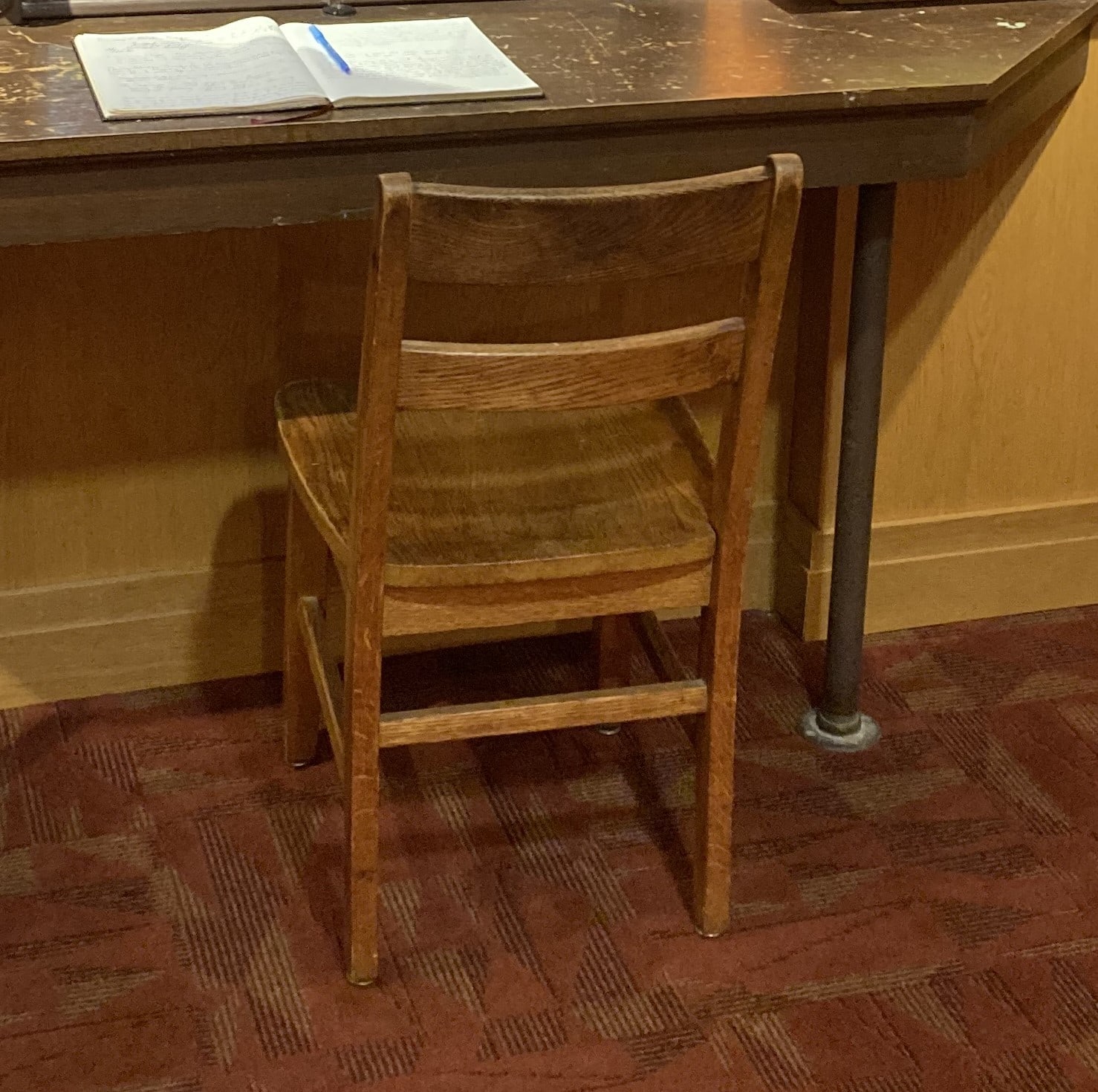 Wooden chair with top rail, mid rail, saddle seat, and box stretcher.