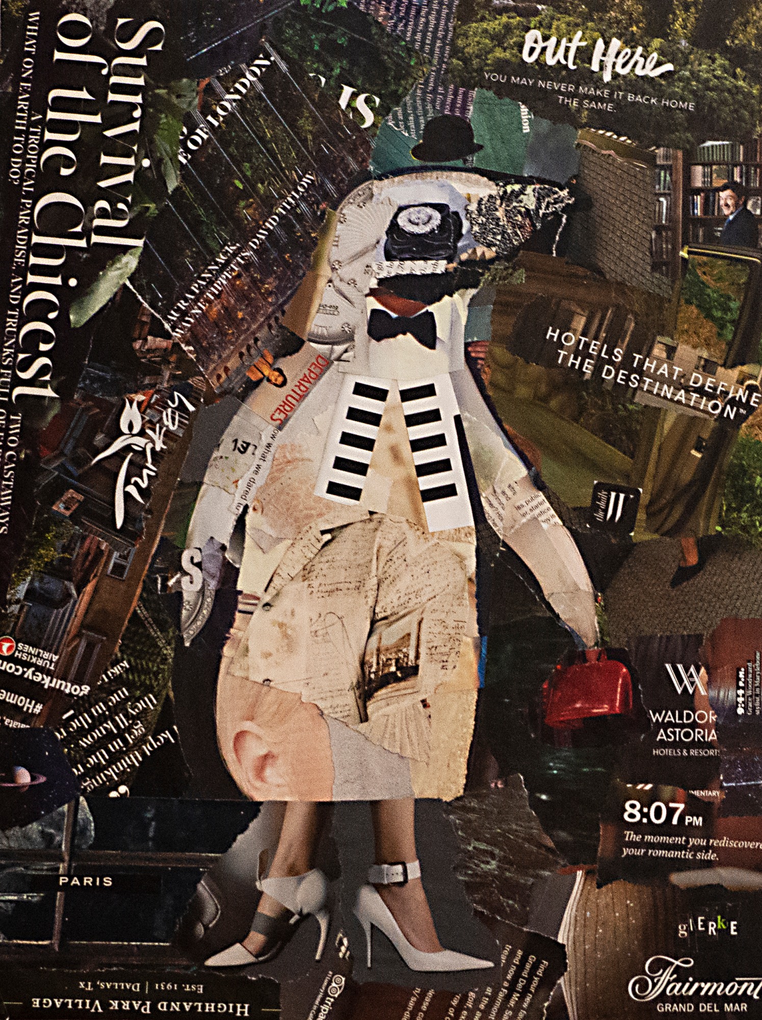 I was on Magdalena Island late March, when the bulk of the penguins had departed for warmer climes. This solo penguin seemed to be saying that he wanted to go to different places than the usual penguin haunts, he wanted to travel the world. He put his imagination to work and envisioned a different life for himself, which I conveyed in this collage.