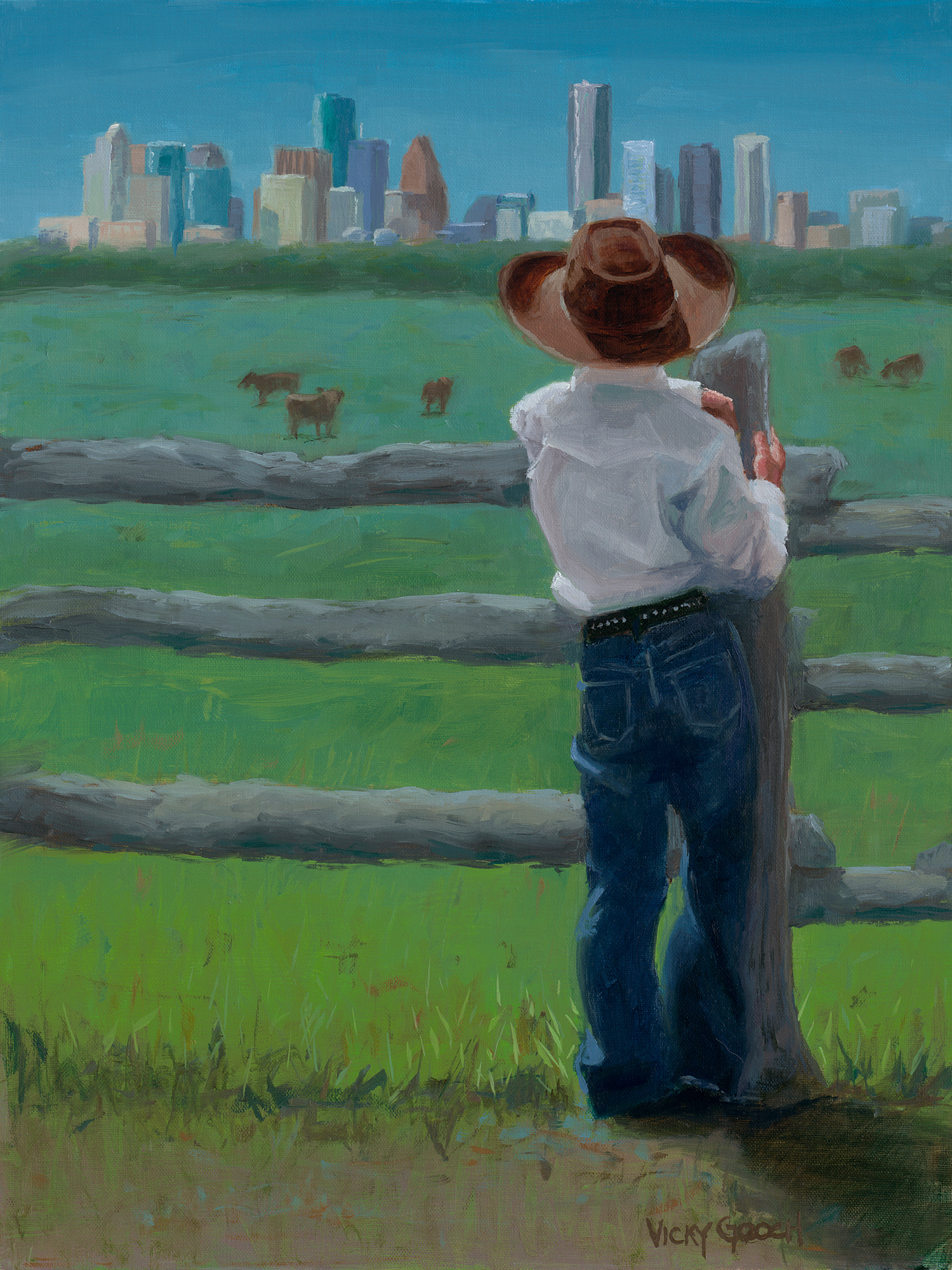 A boy looks over the cattle in the field to the city skyline and ponders the mystery of the unknown.