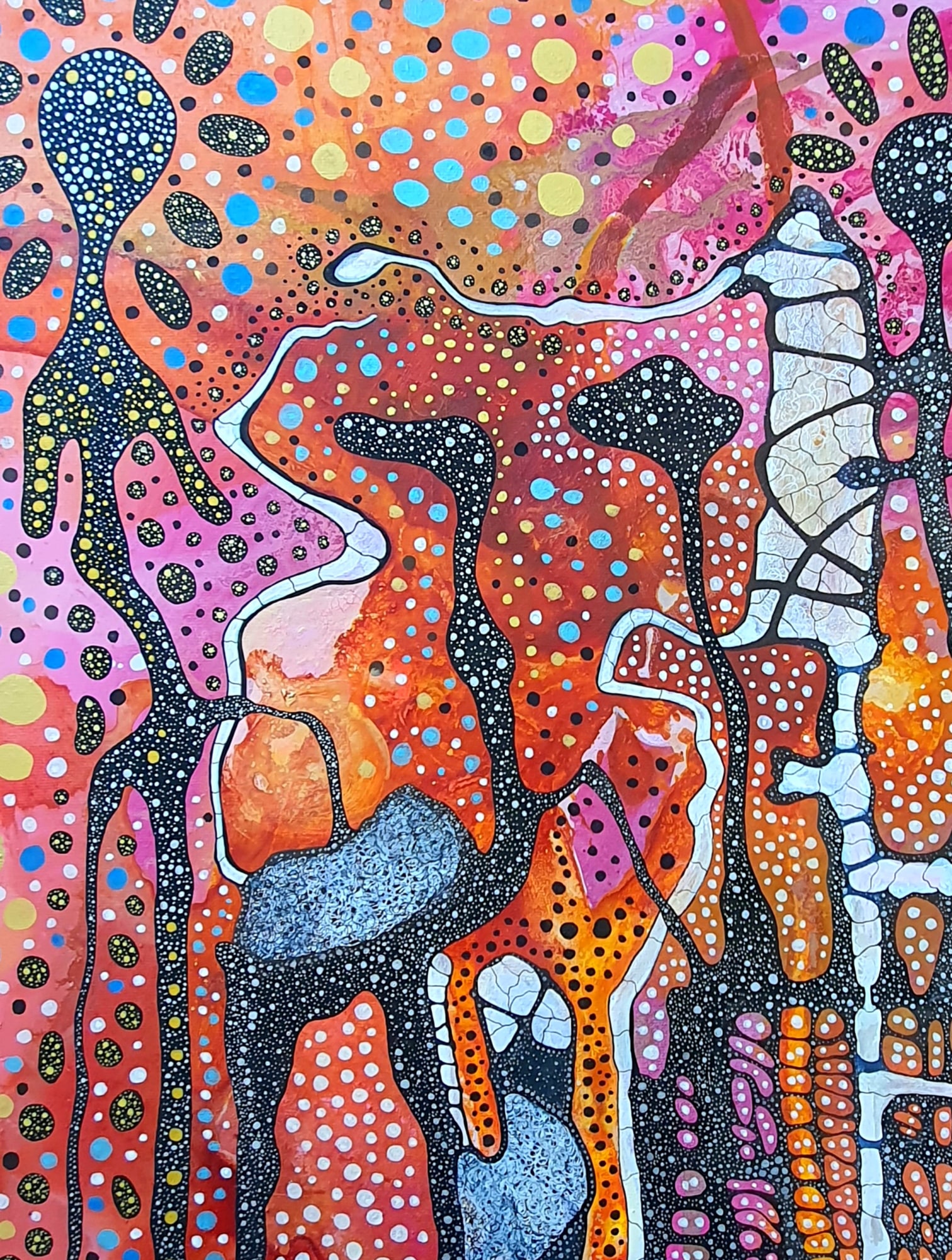 hand-made work acrylics, pigment liners, metallic pens on canvas