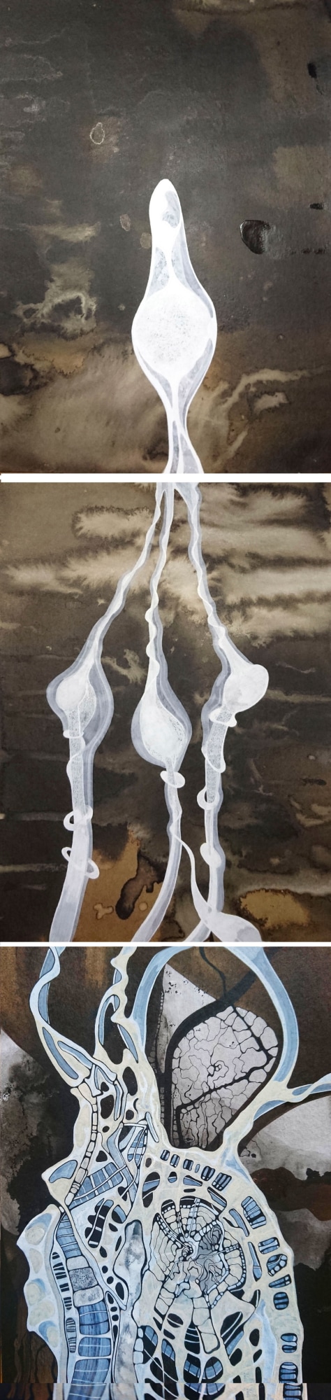 Water colors, China ink, Rapidograph, pigment liners, gel pens