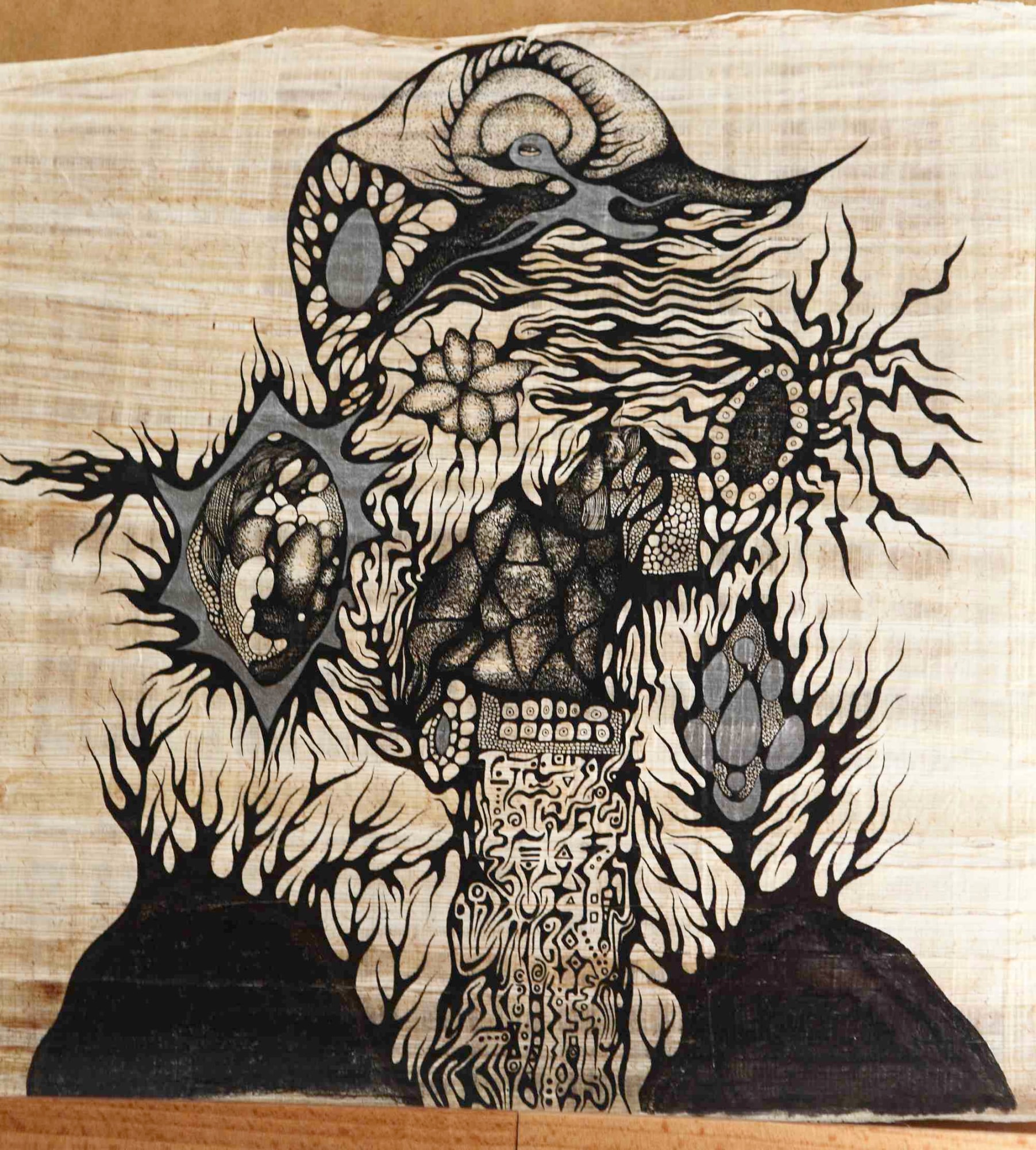 Hand-made drawing Rapidograph, pigment liners, metallic pens on papyrus