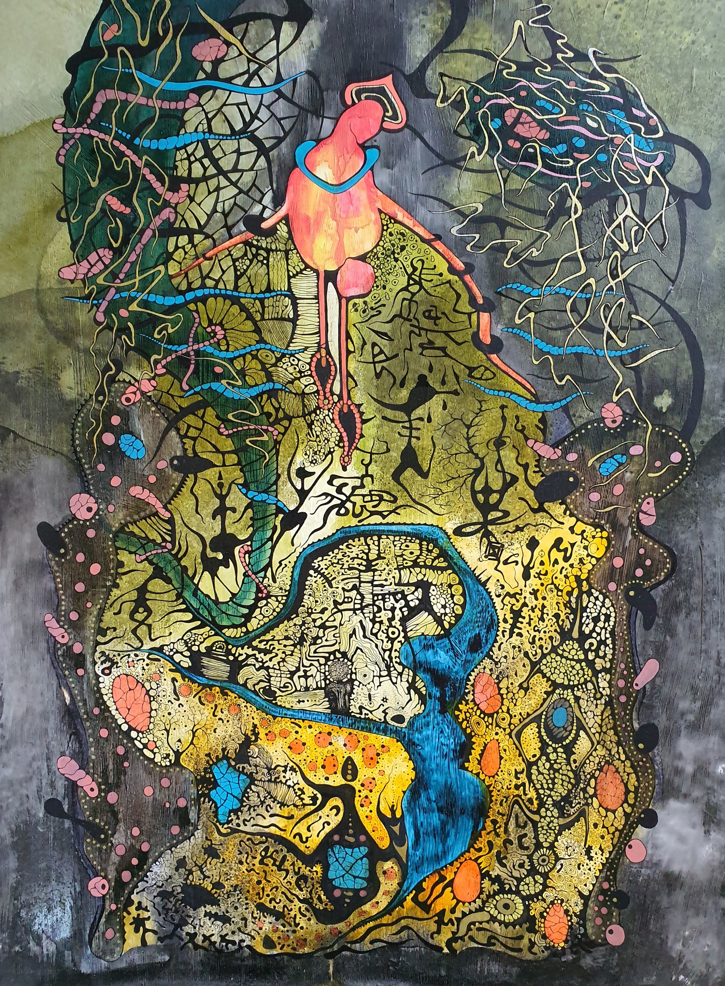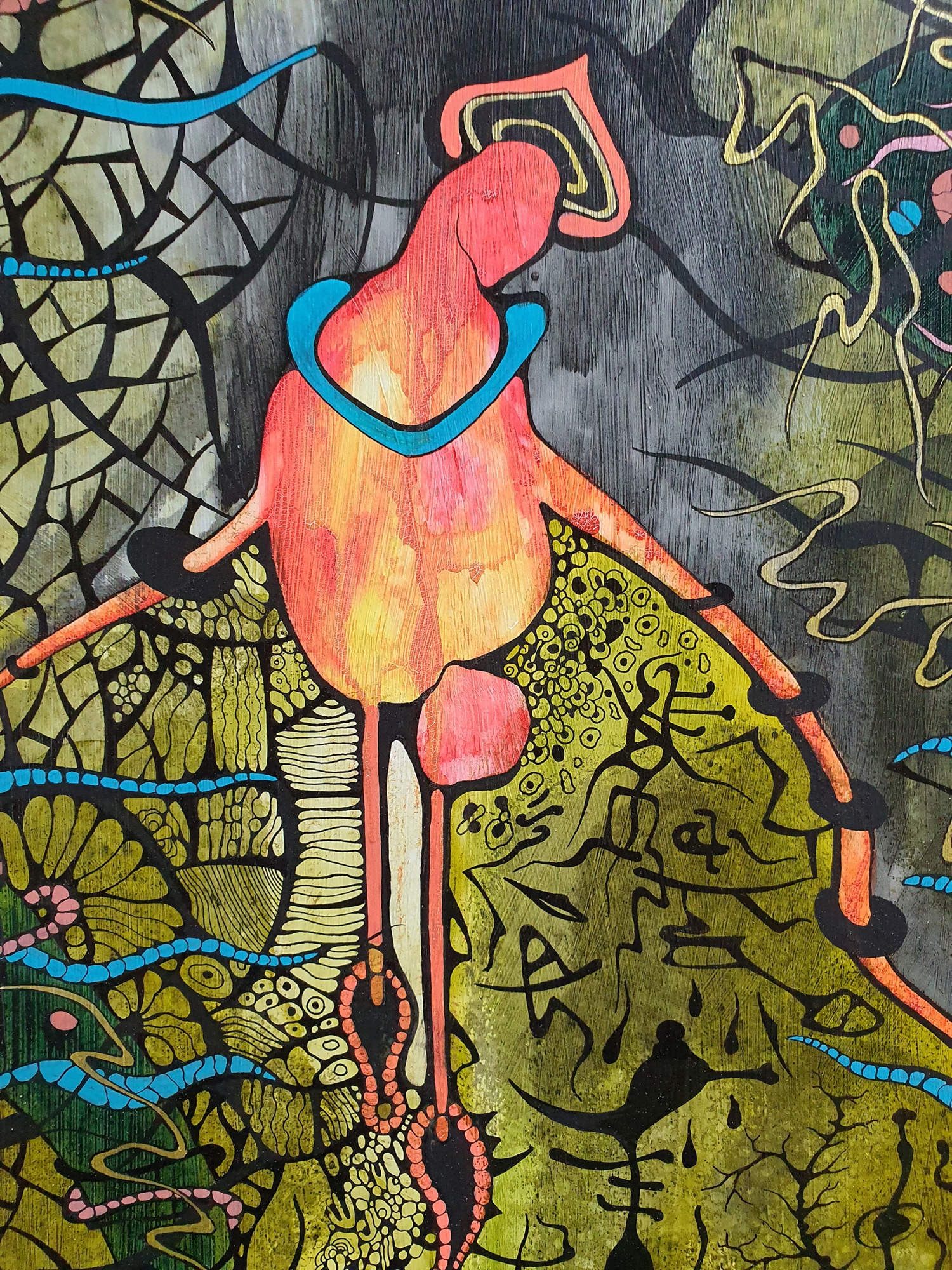 Hand-made work water colors, china inks, metallic pens, pigment liners on wood panel