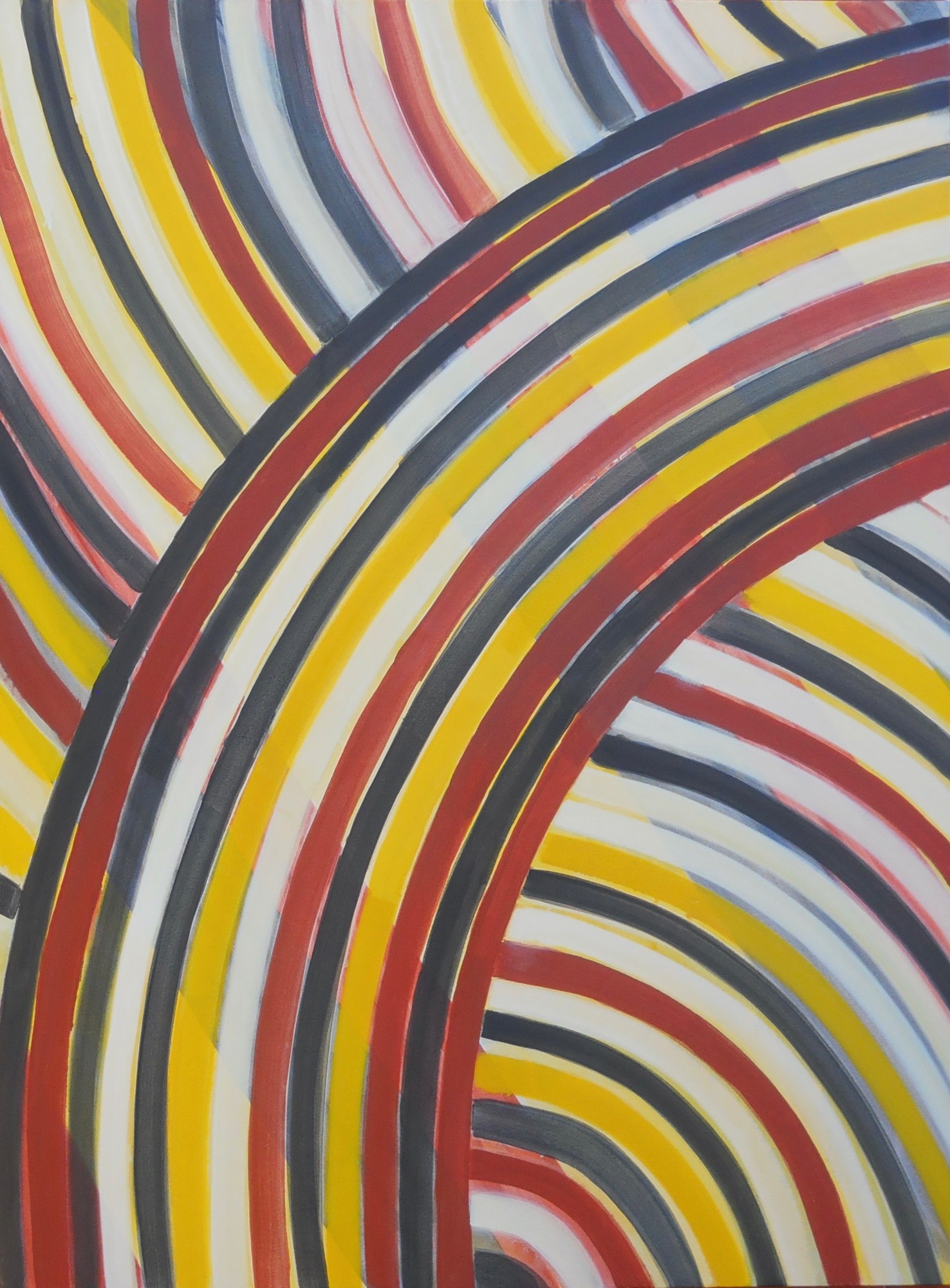 Space between the lines, exposing the underpainting of straight lines, makes a kind of ragged quality. Also the work is more out of drawing than other arch paintings. Not sure I like the work, I'll give it a month in the living room