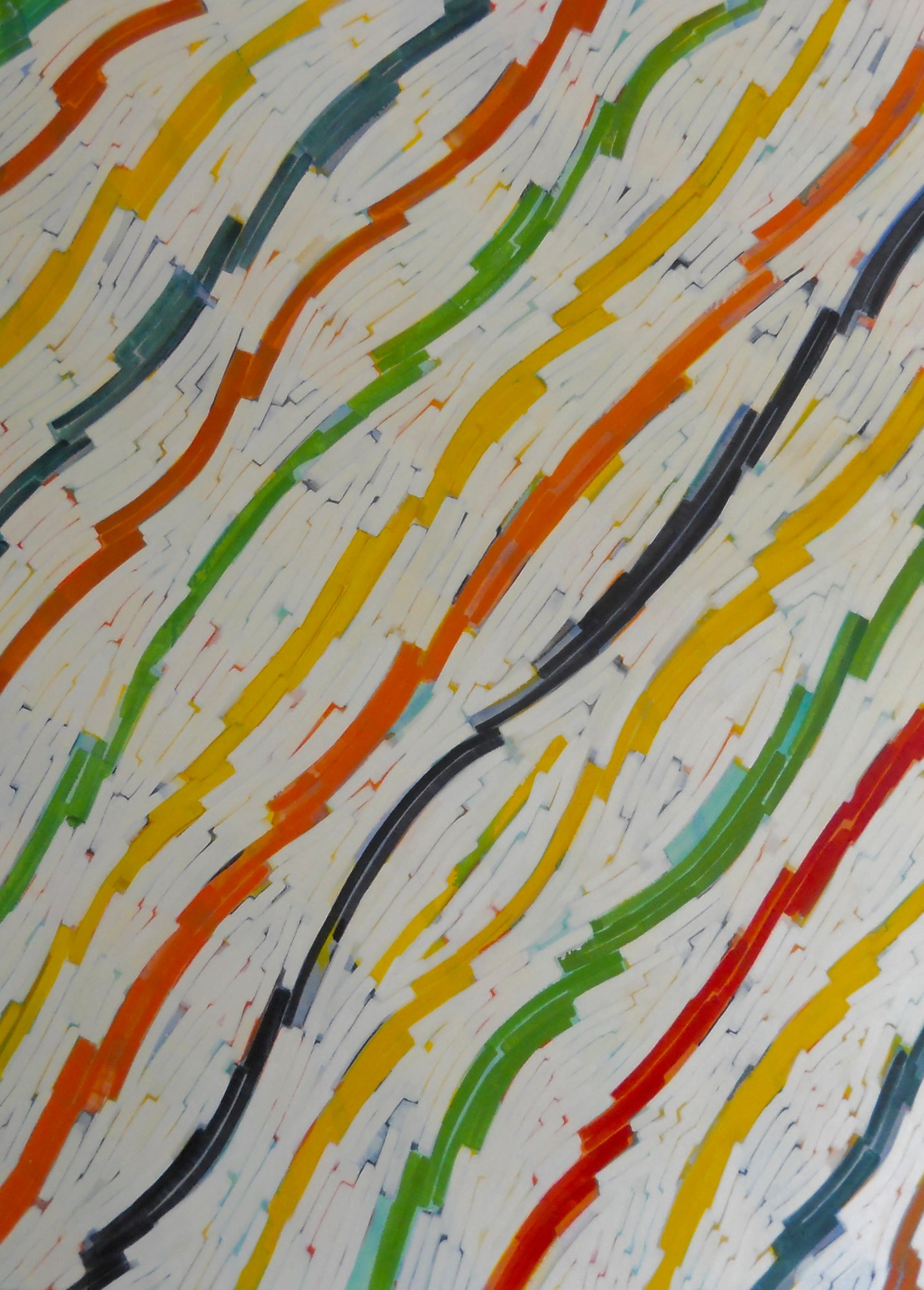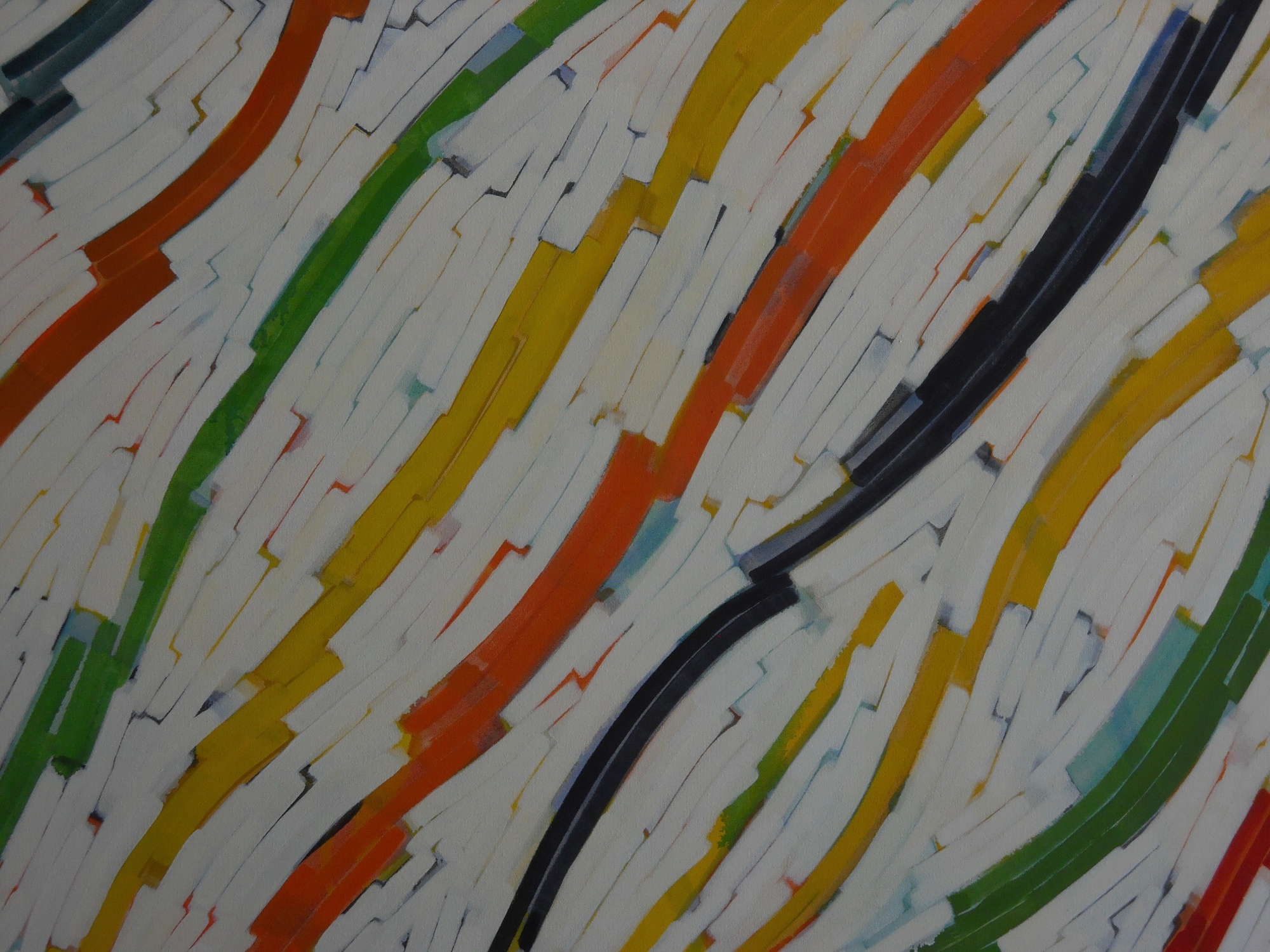 I expanded the white, to perhaps almost its breaking point. That is, much wider and the white would not work as figure, but only as ground. I subdued the cooler colors except for green. Much the same colors are used in the next painting “Summer Solstice” The underpainting has lines perpendicular to the color lines, as in the Co series