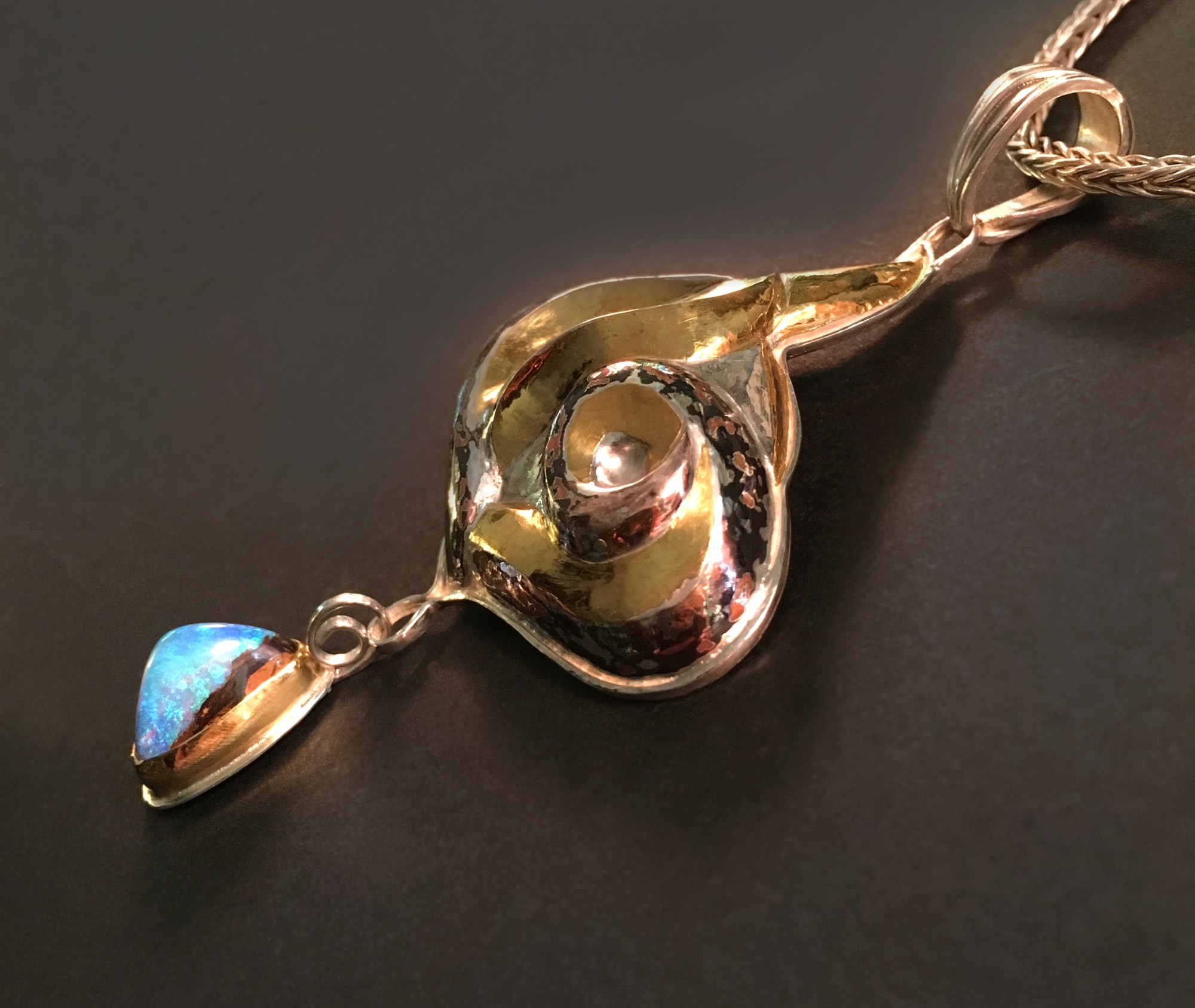 Eastern Repoussé patterned mokume gane and keum boo pendant, suspended from an 18 in. Roman chain