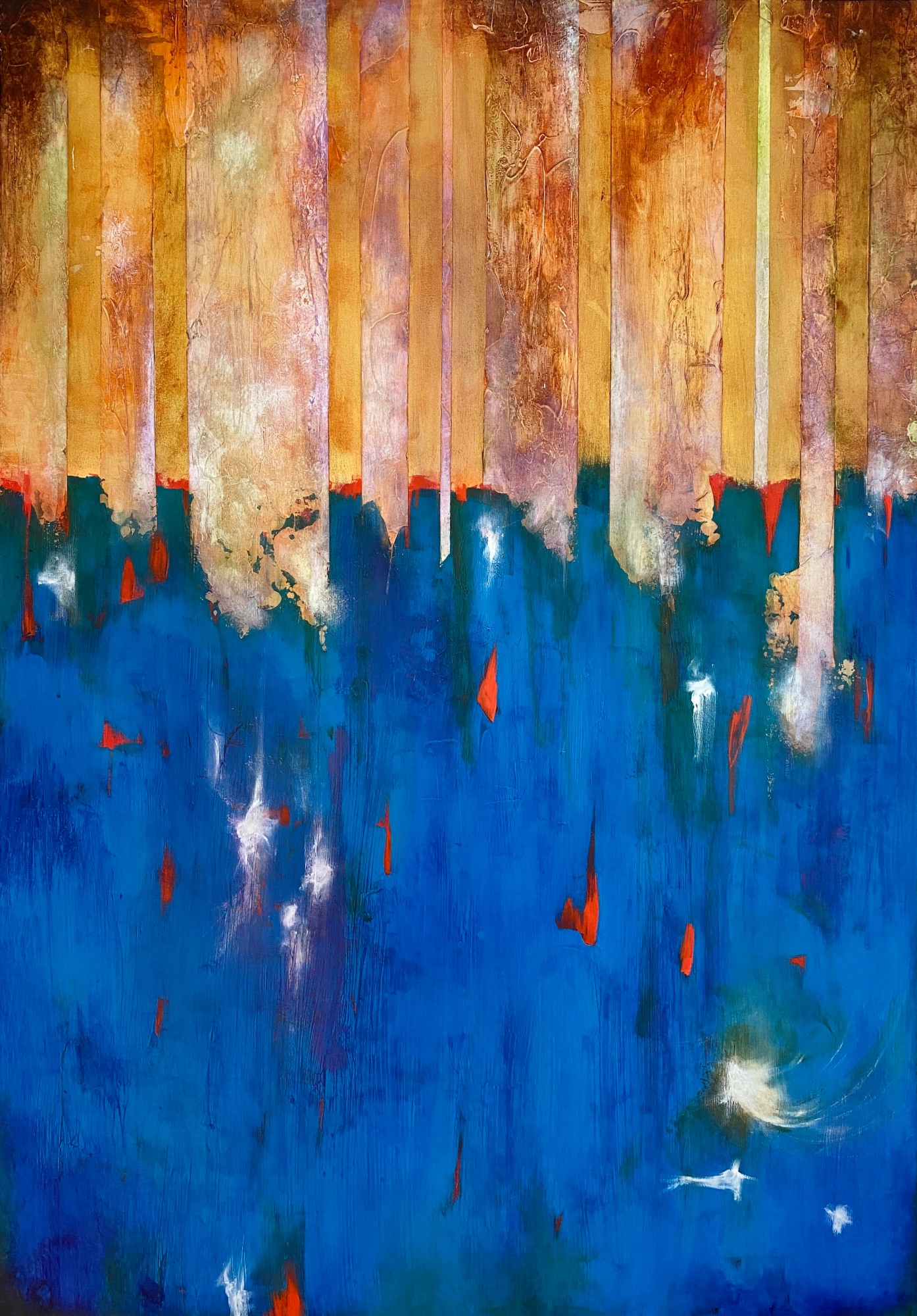 In this painting, falling stars become a connection with the sky and water. The more the light descends, the more it transforms. The red dots in the painting represent the burning heat from the energy of a fallen star. Can you feel the warmth of the glowing sky, as well as the refreshing water?