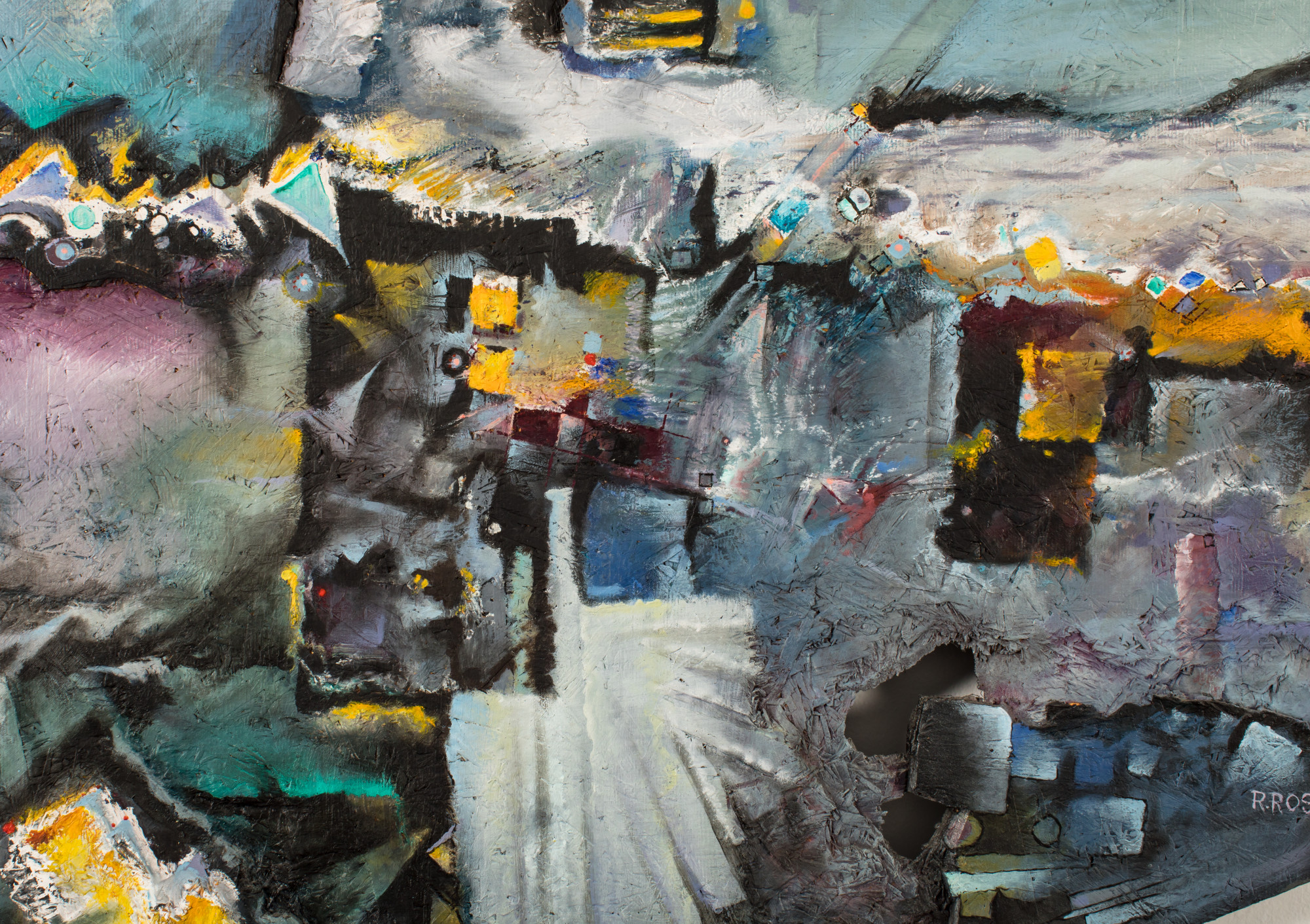 The painting is a study with master painter, sculptor and teacher Anton Weiss. The five elements of composition: contrast, direction, texture, form and color, with color being the least important makes the composition or artist incredibly complex. The concept of art vs craft is another issue the artist notes.