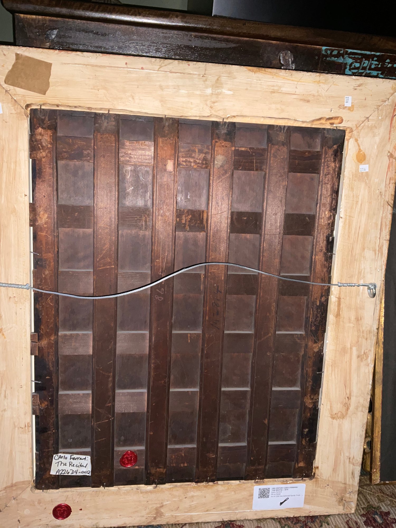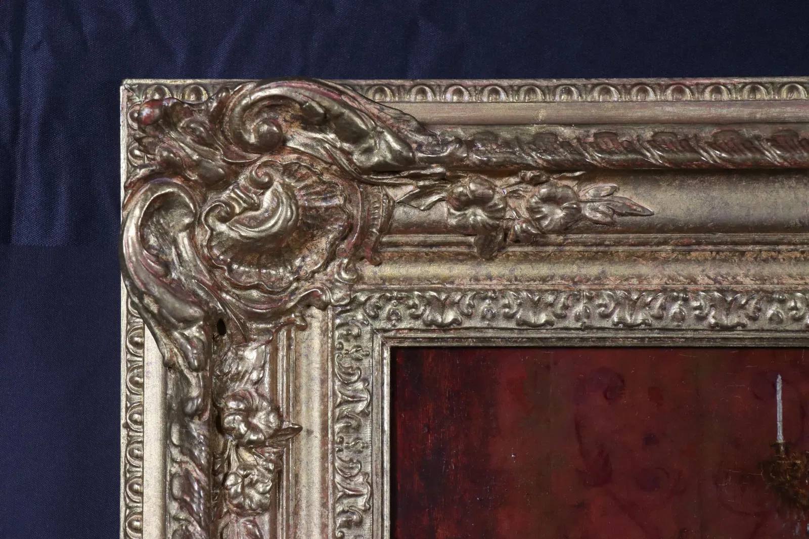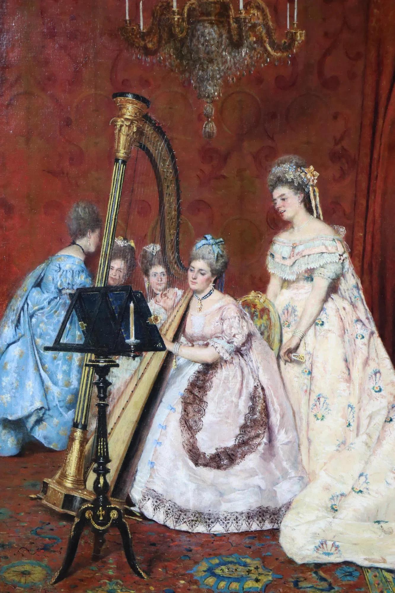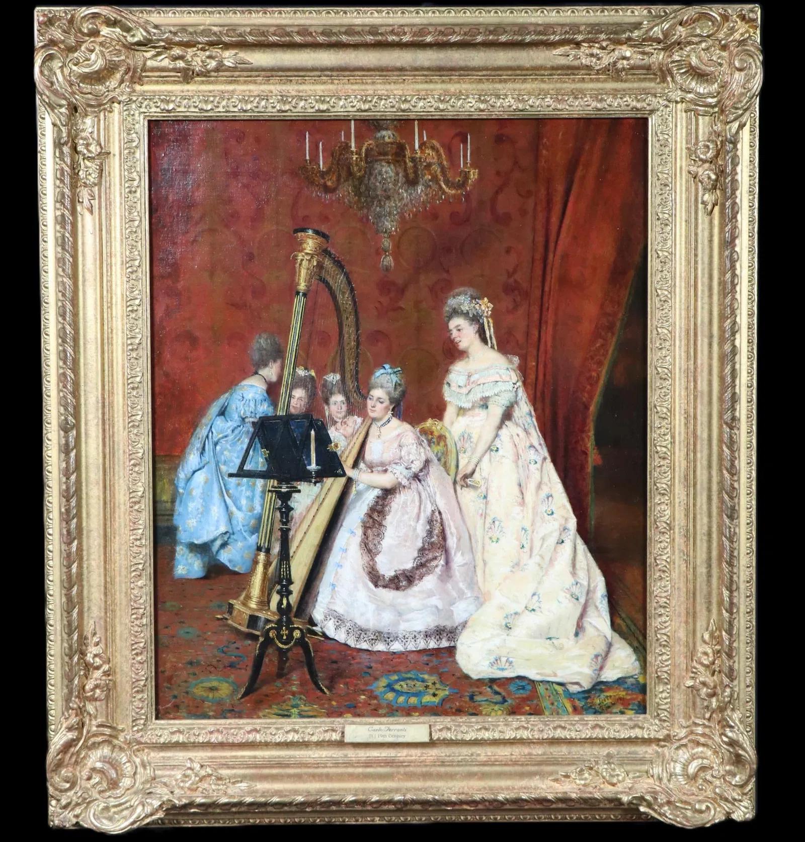 This typical romanticism inspired parlor scene featuring three central figures in period dress and a massive harp. Whilst records of Carlo Ferranti’s life are scarce his paintings frequently appear on the international art market and are characterised by great technical proficiency and life.