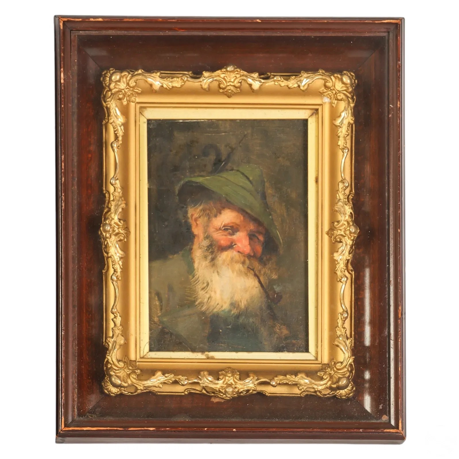 A pair of antique oil paintings on board. Figural works depicting elderly Bavarian gentlemen modeled in ethnographic costume with green Tyrolean caps, and one smoking a carved pipe. No apparent signatures. Presented in heavily gilded carved frames under glass in wood shadowboxes. Sight size measures approximately 6" x 4".