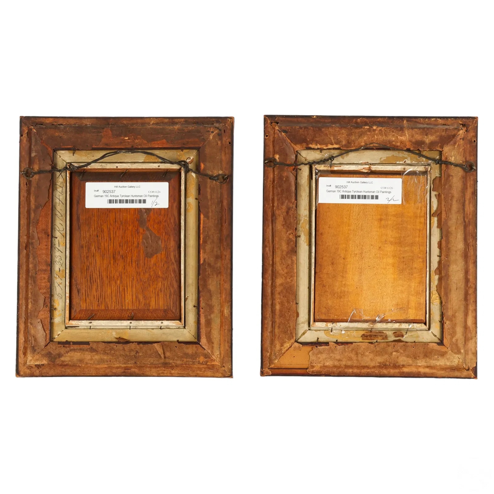 A pair of antique oil paintings on board. Figural works depicting elderly Bavarian gentlemen modeled in ethnographic costume with green Tyrolean caps, and one smoking a carved pipe. No apparent signatures. Presented in heavily gilded carved frames under glass in wood shadowboxes. Sight size measures approximately 6" x 4".