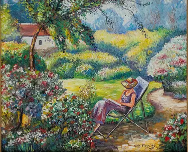 Anita La Michaudiere, an original oil painting by Katia Pissarro (1936-2001), measures 23” W x 19” H. Renowned for her expressive style, Pissarro employs vivid colors and textured brushwork to create this figurative composition. Likely painted in the late 20th century, the piece showcases her refined yet emotional approach to depicting interior and portrait subjects, often intertwined with personal or domestic scenes.