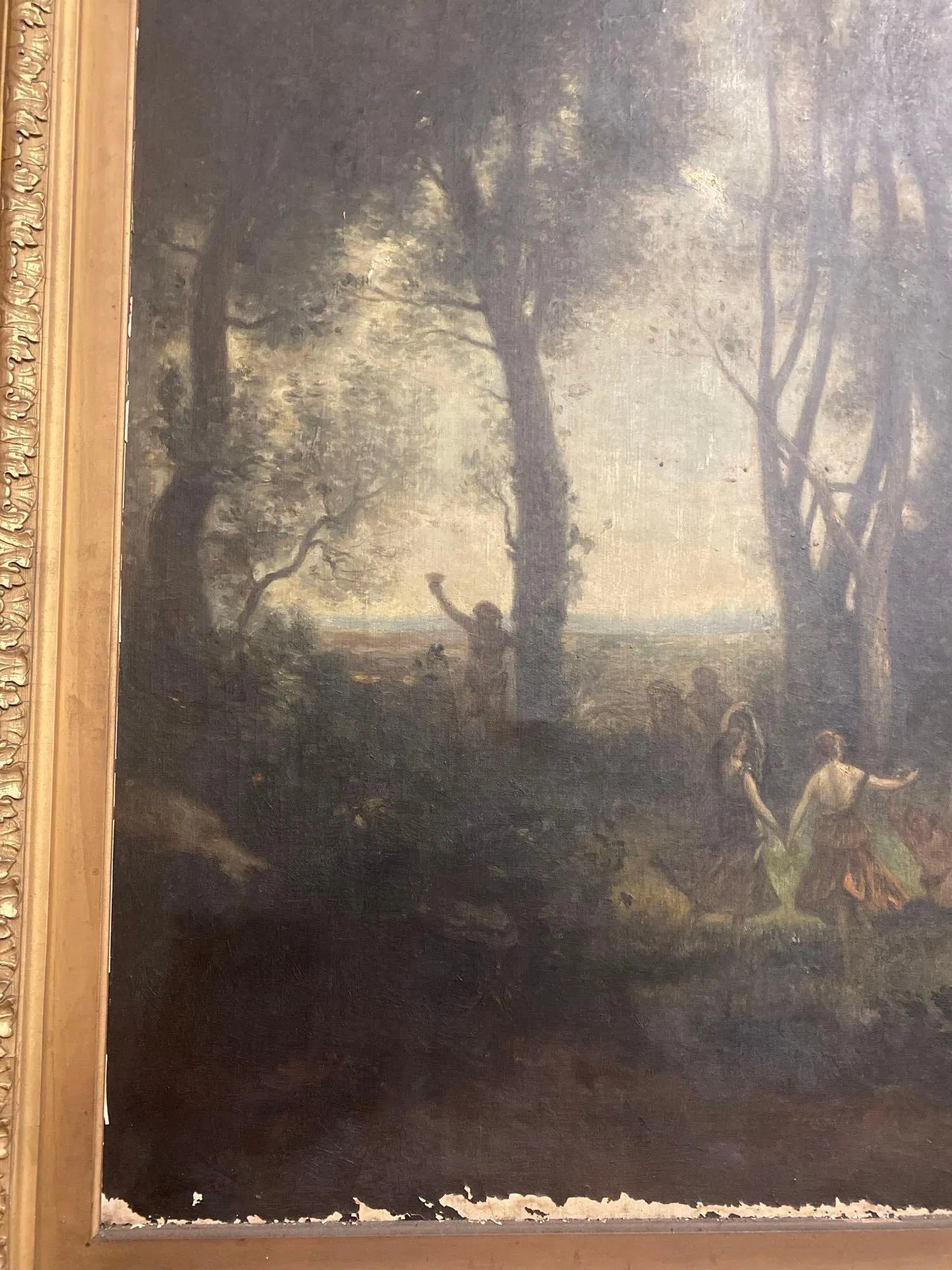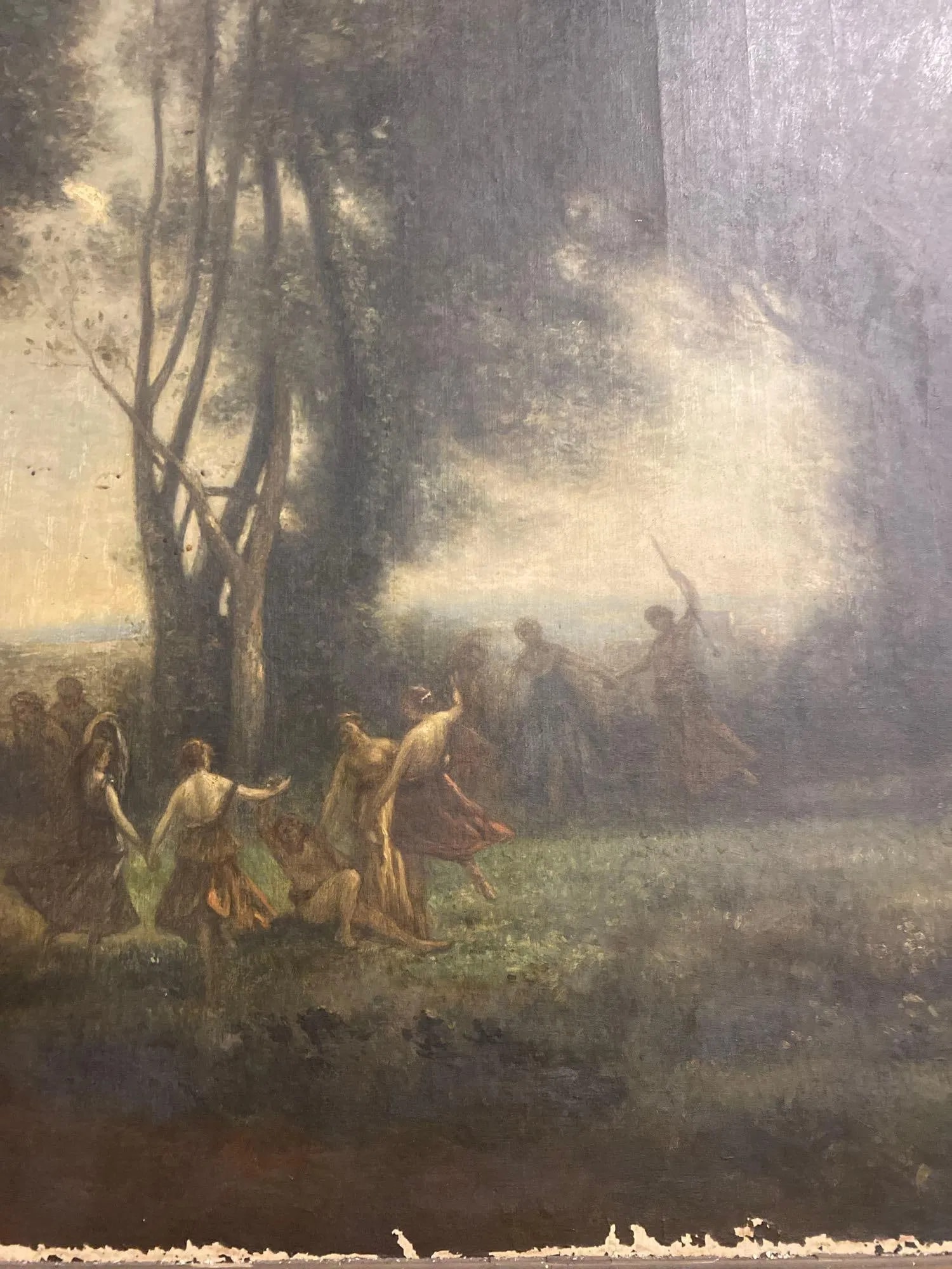 The nymph figures frolic playfully beneath a crisp morning sky, this is an highly decorative and lovely composition executed with a level of skill and artistry by a talented painter who captures the poetic atmosphere through a traditional and "tight" painting technique - with minute exactness, clear outlines, thin brush work, but with absolute definition of objects throughout.The romantic subject of the present artwork is closely inspired by an important work by the great Camille Corot, which is now exposed at the Musée d'Orsay (Paris).