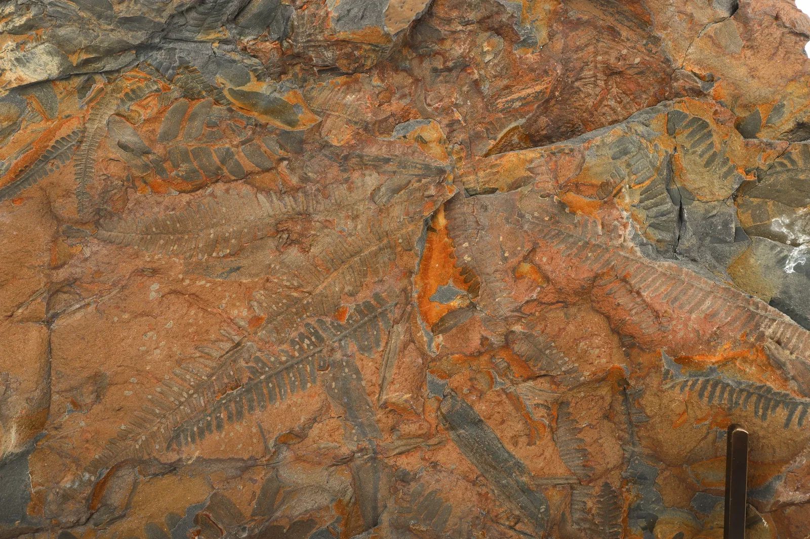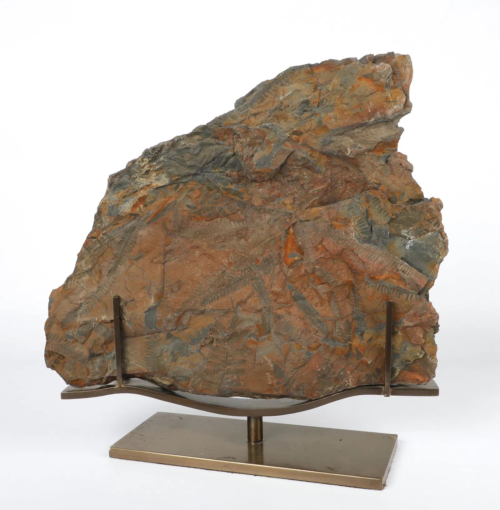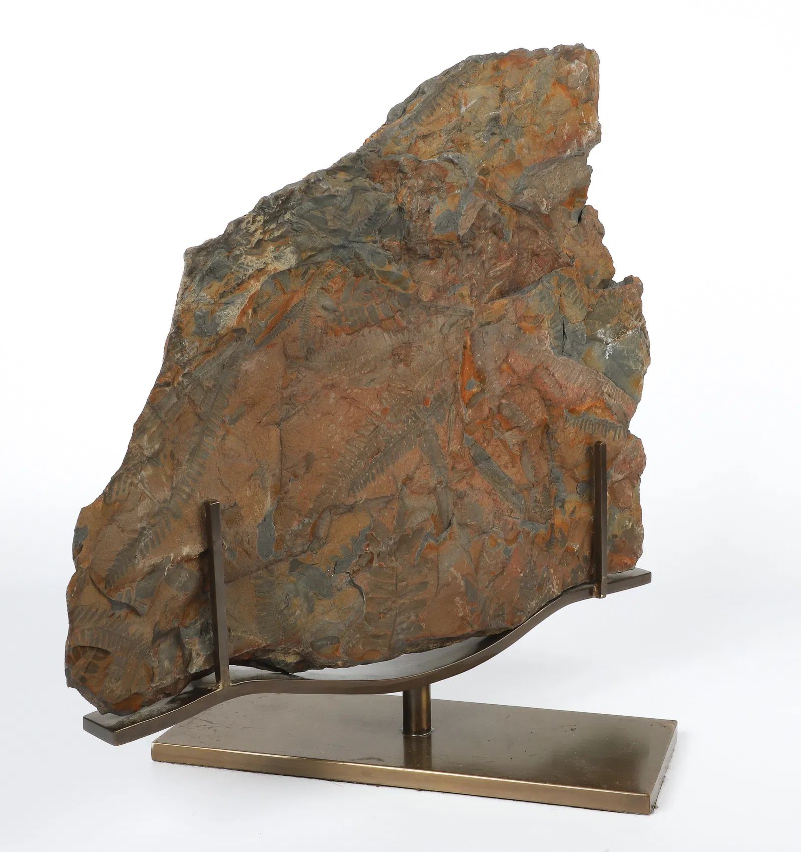 This an example of fossilized Pecoptens Tree Fern encased in a matrix of reddish brown shale slab was uncovered during road cuts. Likely formed 300 million BC this specimen was found in 1903 at Ambridge, Pennsylvania US. Mounted on a rotating brushed brass stand, 18 1/2"L x 15"H, 18 3/4"H in stand