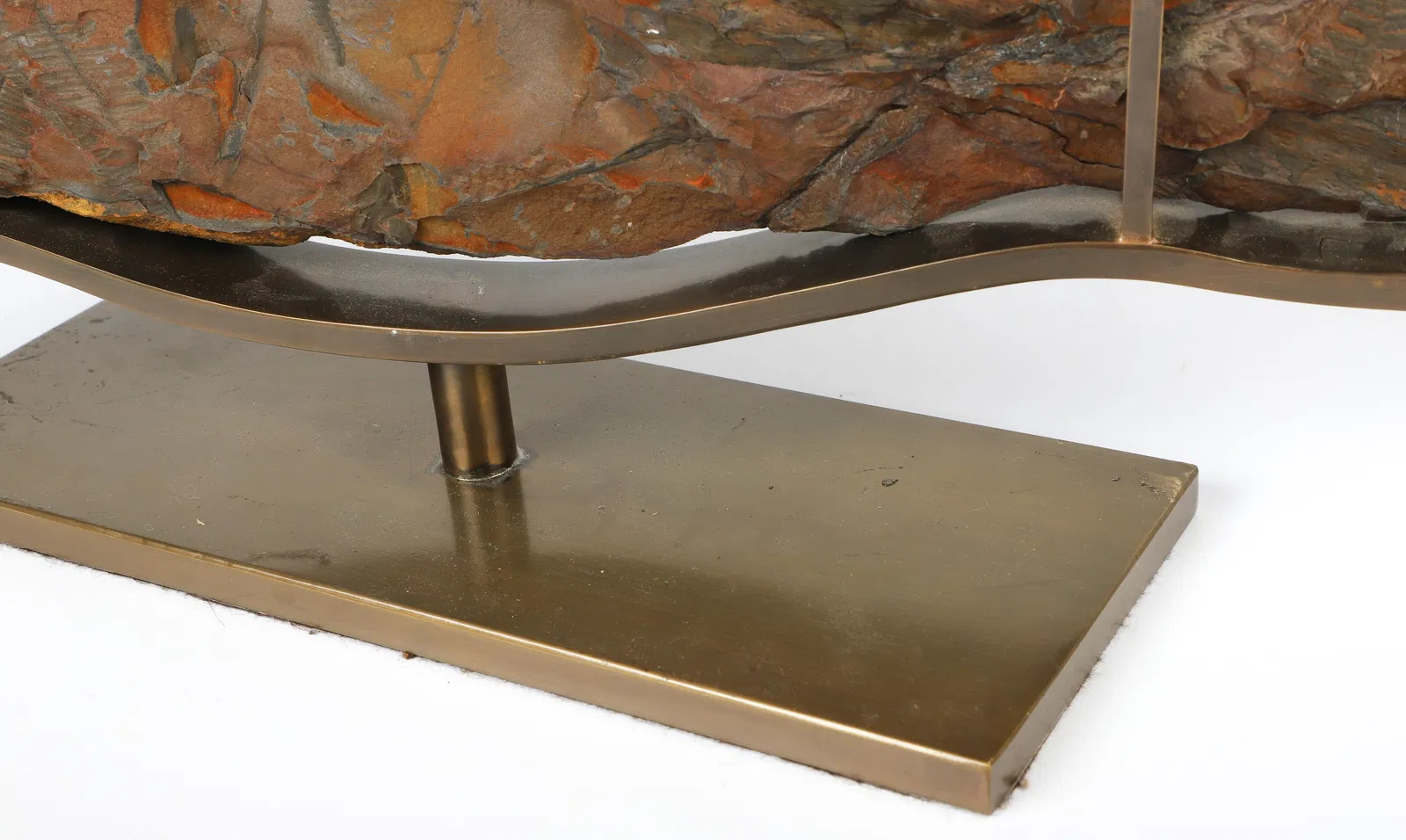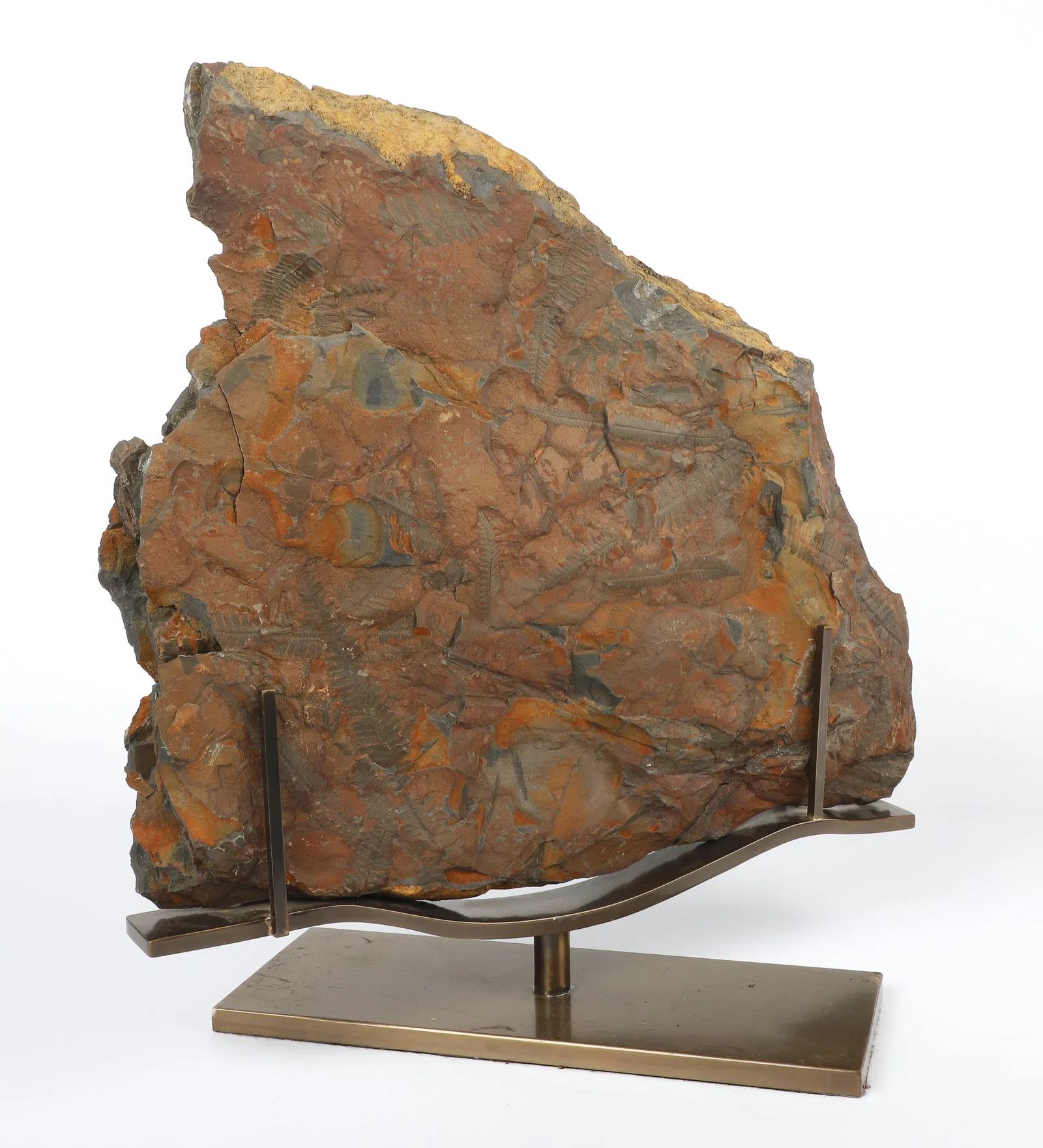 This an example of fossilized Pecoptens Tree Fern encased in a matrix of reddish brown shale slab was uncovered during road cuts. Likely formed 300 million BC this specimen was found in 1903 at Ambridge, Pennsylvania US. Mounted on a rotating brushed brass stand, 18 1/2"L x 15"H, 18 3/4"H in stand